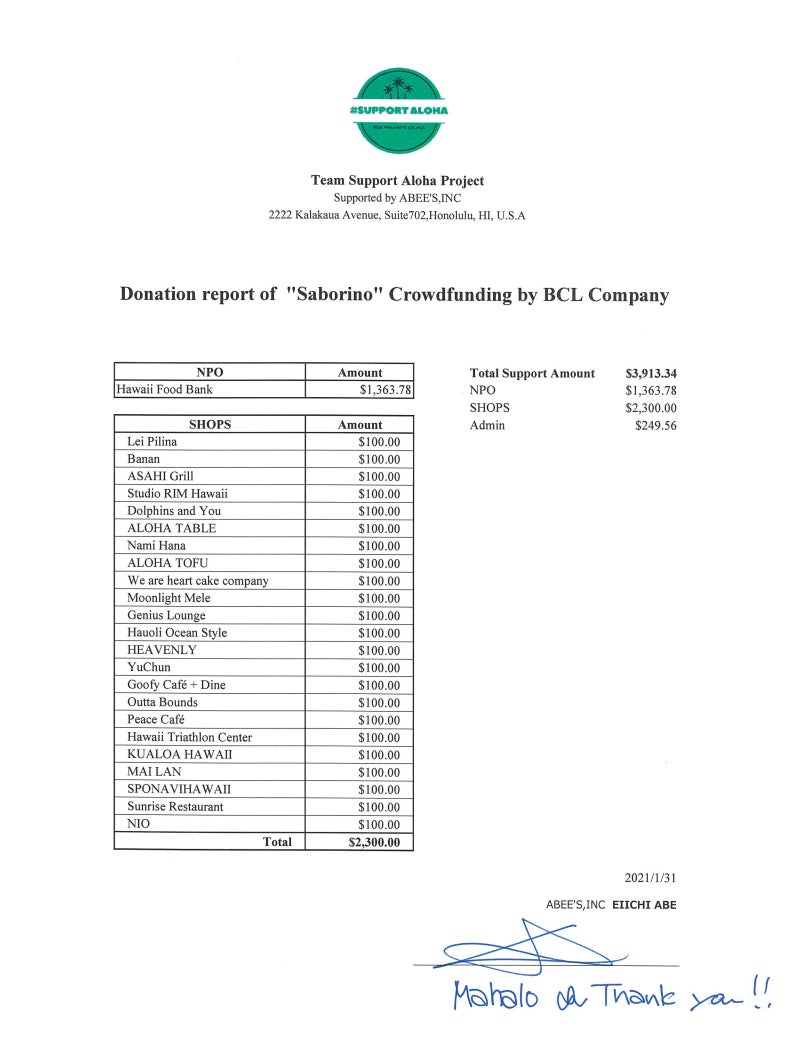 送金先のSUPPORT ALOHAより報告を受けておりますので皆様にもご共有いたします。