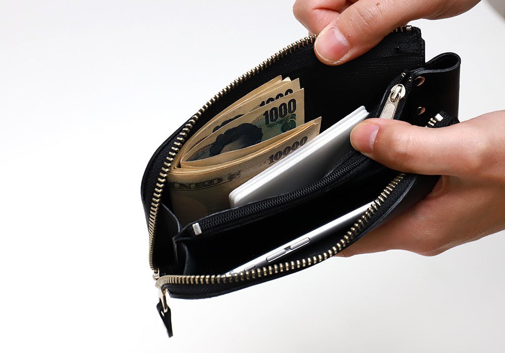このように「ポーチ」の状態から左手に持った時「L字長財布」になります。