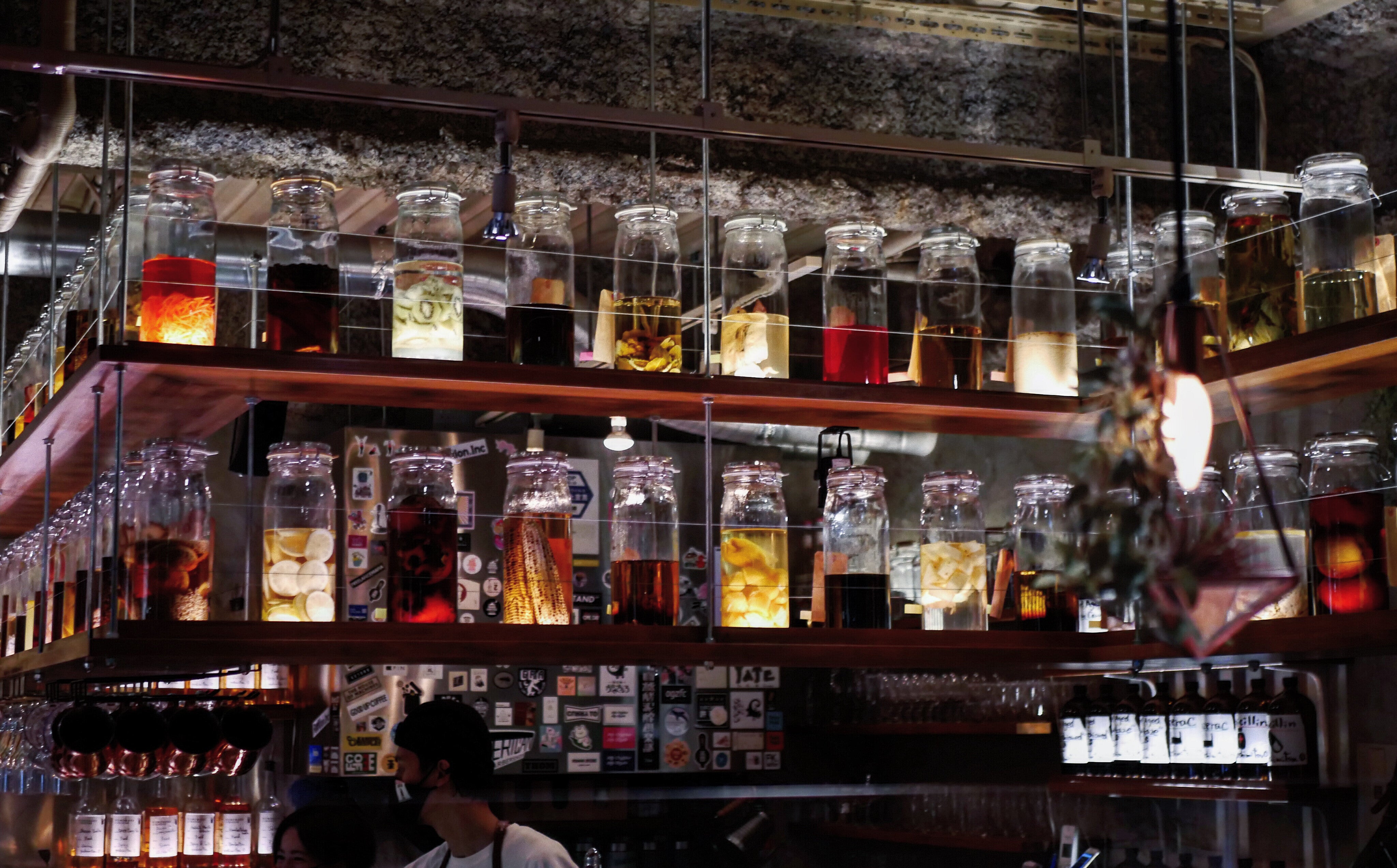 ボトルの中にはコーヒー豆や野菜さらにはベーコン(!)など様々なものがアルコールに浸漬されています。壮観。
