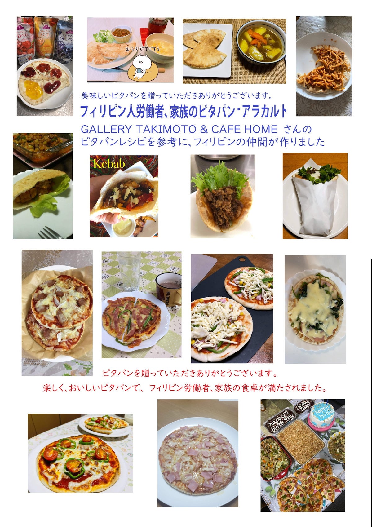 株式会社 タキモト様NPO法人 報徳食品支援センター様 カサ デ アミーゴスの高原、水野です。 フィリピン人グループリーダーのリタさんから、ピタパンクッキングの報告とお礼がありました。みなさんで、ピタパンをいろいろクッキングし、たくさん、美味しく食べたよとのことです。美味しいピタパンのプレゼント、ありがとうとのことです。 フィリピンでは、9月、10月からクリスマスソングが流れ、クリスマス飾りが街をにぎやかし始めますが、今年はコロナの影響で、日本で暮らすフィリピン人の労働者や家族は、そんな雰囲気にはなれないようです。せめて、家族で迎えるクリスマスは、美味しいピタパンアラカルトで楽しいクリスマスを迎えたいですね。 皆さんのピタパン、彩りよく、にぎやかで、楽しく、美味しそうです。 ( カサ・デ・アミーゴスでは、ピタパン配付の時に、タキモト様ご紹介のピタパン調理例を、英語、スペイン語、ポルトガル語に訳し、配らせていただきました。)