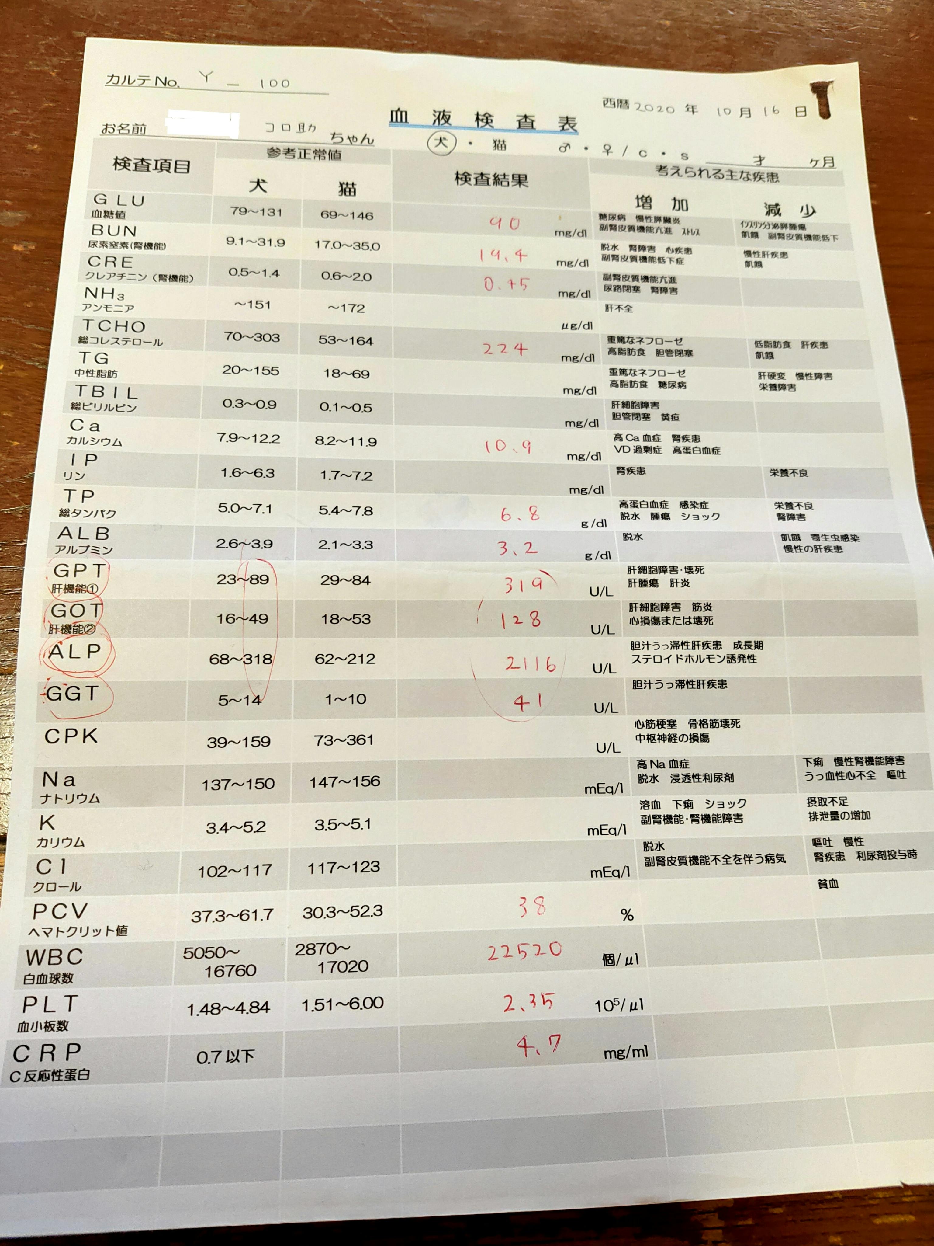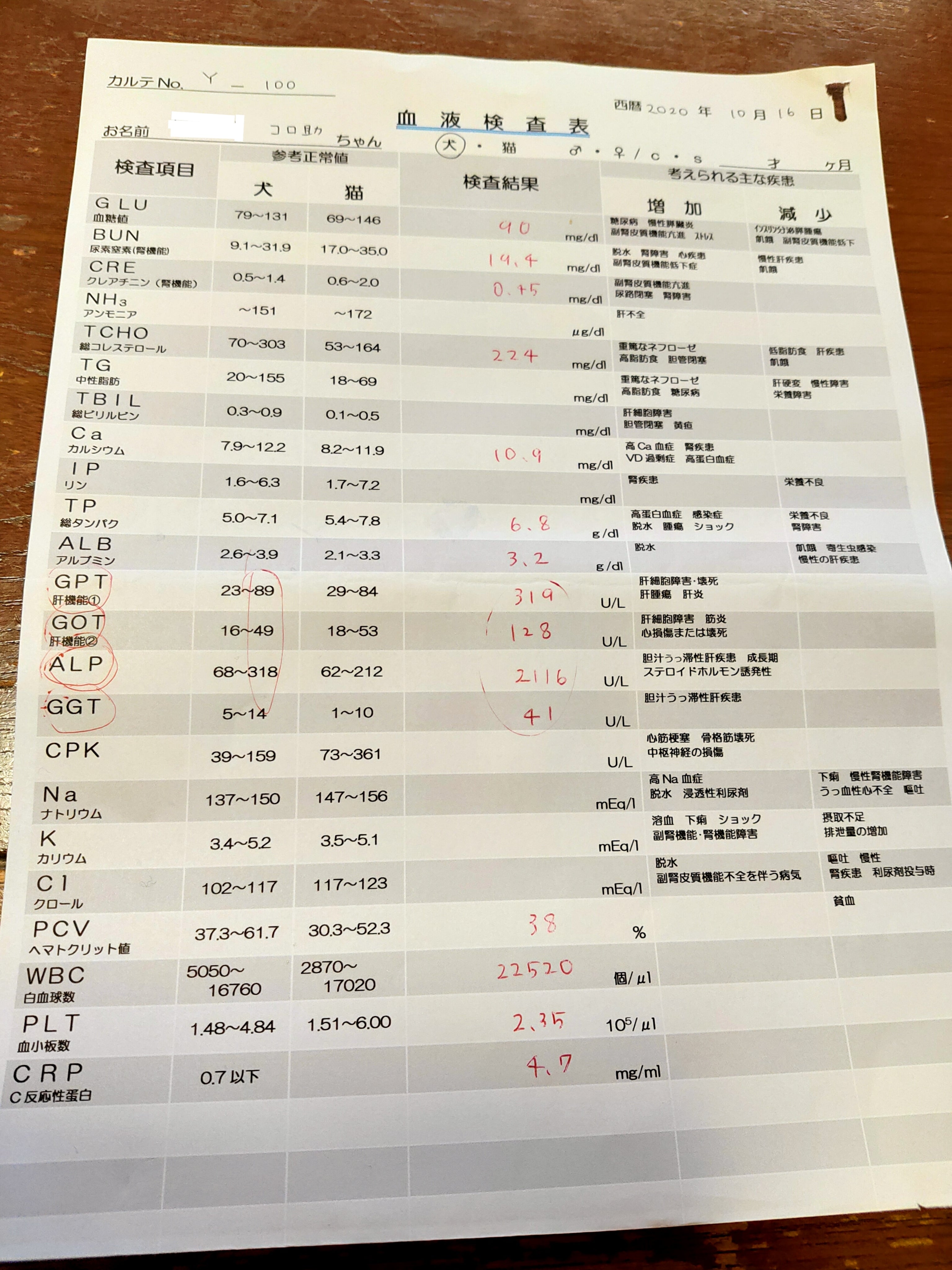 病気一つしなかったけど、健康診断は欠かさないし、9月中旬に血便が出たときにはすぐに病院を受診しました。かかりつけだった獣医師は、「腸炎だね。大丈夫大丈夫。」と言っていました。でも、1週間経っても、2週間経っても良くならず、ついには食事もとれなくなりガリガリに痩せてしまいました。連日の点滴と内服、コロちゃんはたくさんたくさん頑張りました。歩くこともままならない弱った体を引きずって、私に甘えてくれます。私は「これはおかしい」 と思いながらも、別の病院に診てもらうことが先生に悪いのではと思ってしまい、発見が遅れてしまいました。ようやく知人に紹介された病院に行った時には、もうかなり進行しており、状態はとても悪いと言われ、絶望しかありませんでした。
