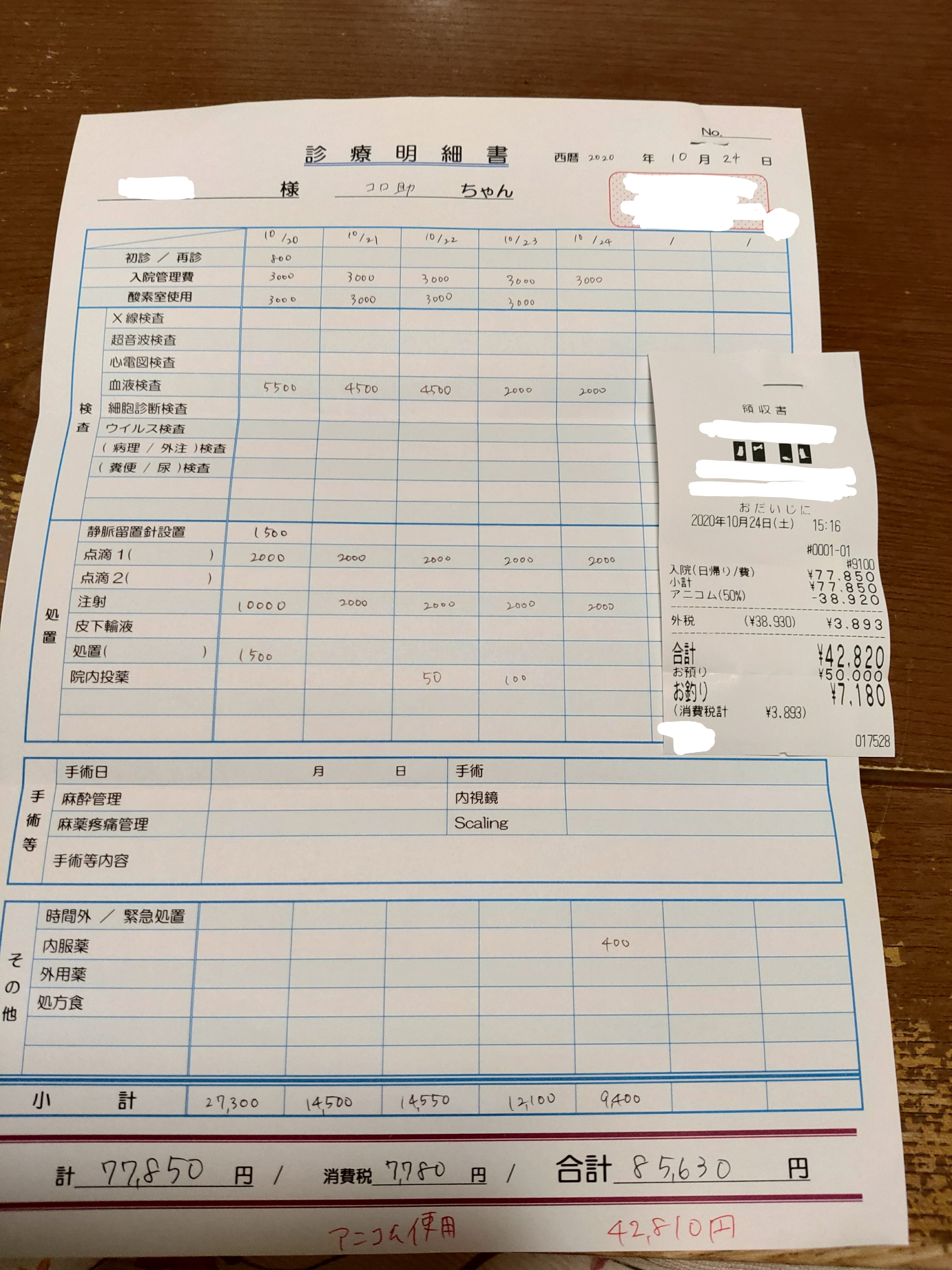 ※入院中につきまだ一部しかありませんが、今後治療が進みましたら治療費の内容を継続して掲載させていただきます。一部病院等の情報部分は加工させていただいております。