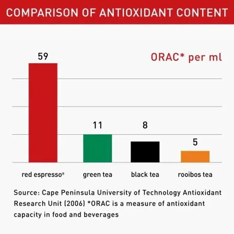 レッド・エスプレッソのショット一杯(60ml)に含まれる抗酸化物質は、緑茶の約5倍、通常のルイボスティーの約10倍、にんじんジュースの約20倍に相当します。