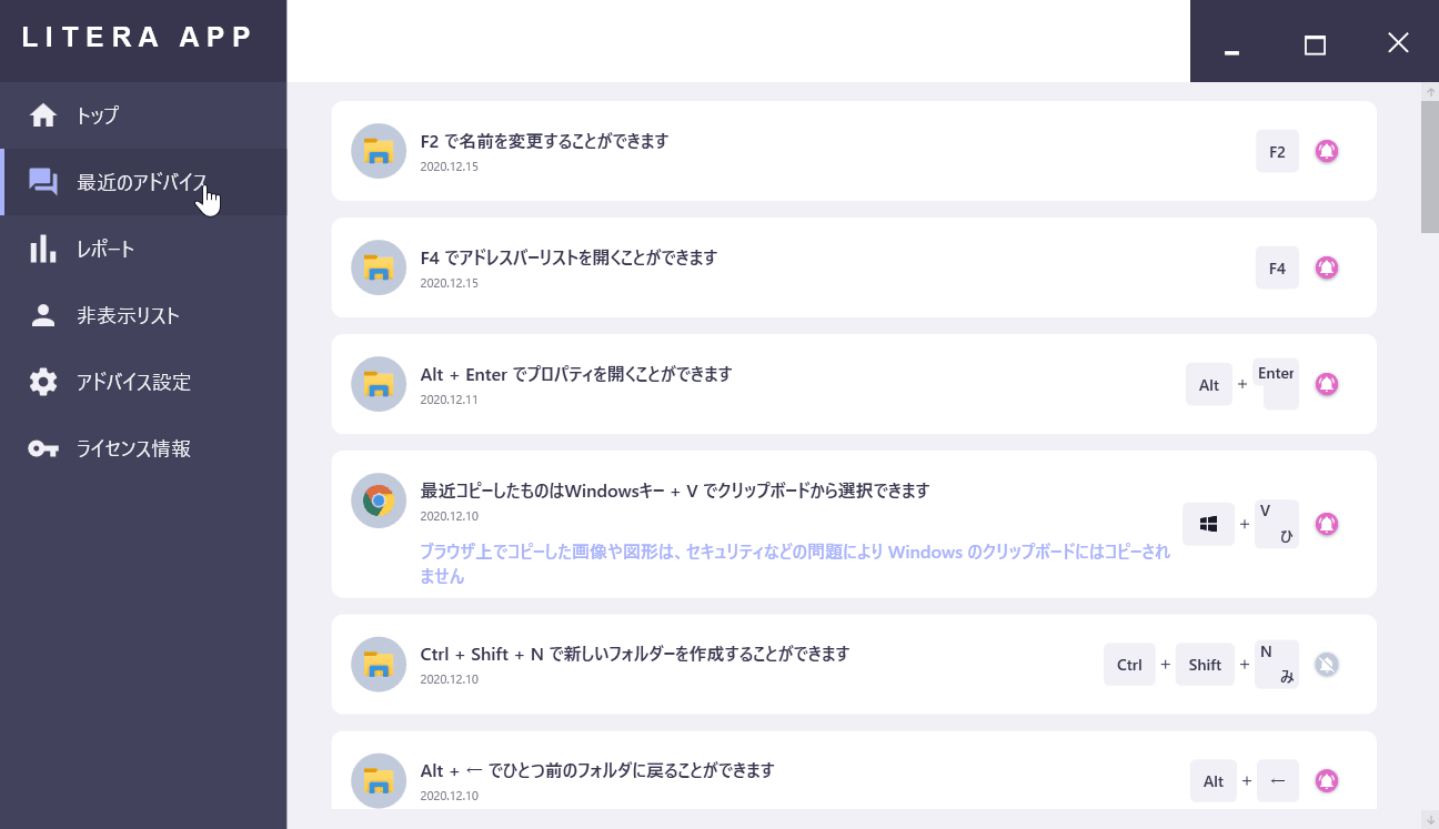 【リテラアップとは】 パソコンにインストールすると、いつものように操作をしているだけで、ショートカットを含めた、様々な業務効率化アドバイスがその場で表示されるソフト(Windows版)です。