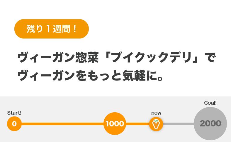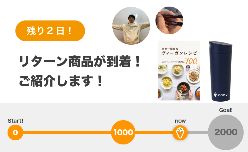 こんばんは。ブイクックの工藤です。ついにクラウドファンディング終了まで残り2日となりました。今日は、リターンにしていた商品が届いたのでご紹介したいと思います。もうすぐ終了となってしまうので、支援するかどうか、どのリターンを選ぶか悩まれている方の参考に少しでもなればと思います。まずは結果報告から!現時点でブイクックデリを届けられた数は...合計1,600食でした!(合計販売数で計算しています)詳細はこちら!・支援者数 288人・支援総額 2,009,790円・達成率 129%それでは、リターン商品のご紹介に移りたいと思います!!ブイクックのロゴが印刷されたオリジナルのマイ箸です!「これは可愛い!」と意気揚々と作ったのですが、まだ3名にしかご支援いただいておりません...。3名には感謝です。お箸がちょうど欲しかったという方、ぜひとも選んでいただけると嬉しいです!ブイクックのロゴが印刷されたオリジナルのタンブラーです!こちらはまだ手元に届いていませんが、イメージはこのようになっています。このタンブラーを持ってチェーン店に行けば、プラスチックも使わず、数十円安くなって注文することができます!(店舗によります)ブイクックのロゴが印刷されたパーカーです!動物性素材は使っておらず、着た感じも柔らかくてよかったです。ブイクックロゴの主張は強めなので、ブイクックを愛する方にはぜひ着ていただきたいです!2020年8月に出版したレシピ本『世界一簡単なヴィーガンレシピ』です!前回のクラウドファンディングで1,100部販売され、amazon等で1,500部ほど販売されています。まだ手に入れていない方は、ぜひこの機会にお求めください!目標の2,000食まであと400食ほどとなりました。ここまでご支援してくださった皆さんや、いつもシェアのご協力いただいている皆さん、、本当にありがとうございます。3週間ほどお騒がせしてきましたが、ついに終了まで残り2日となりました。ブイクックデリをより良いサービスにするため、最後までご協力いただけると助かります。よろしくお願いします。