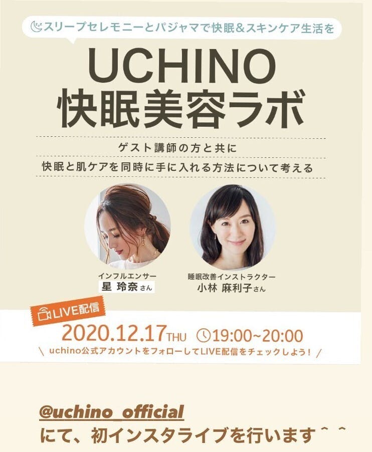 12/17(木)19時~ 美容関連会社を経営されている星玲奈さんと睡眠インストラクターの小林麻利子さんに登壇頂き、「快眠とスキンケア」をテーマにトークセッションを開催します。UCHINOのインスタアカウントをフォローして是非ご参加下さい!
