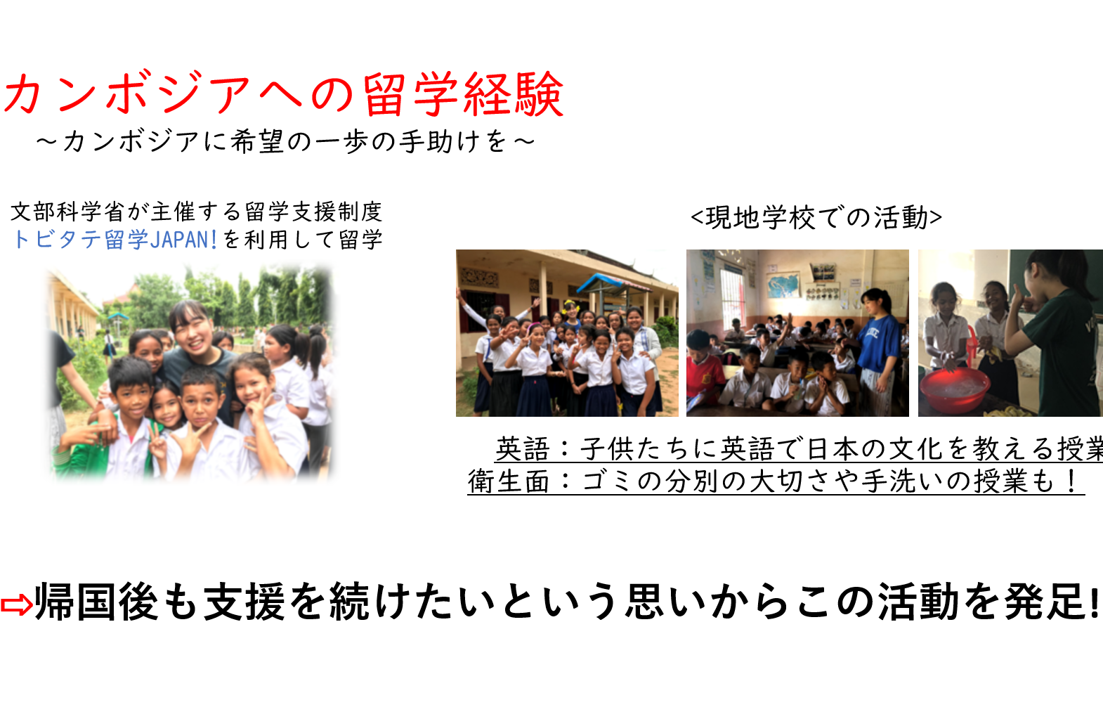 カンボジアの教育の現状を多くの方に知ってもらい、自分たちのできることを精一杯努めてまいります。