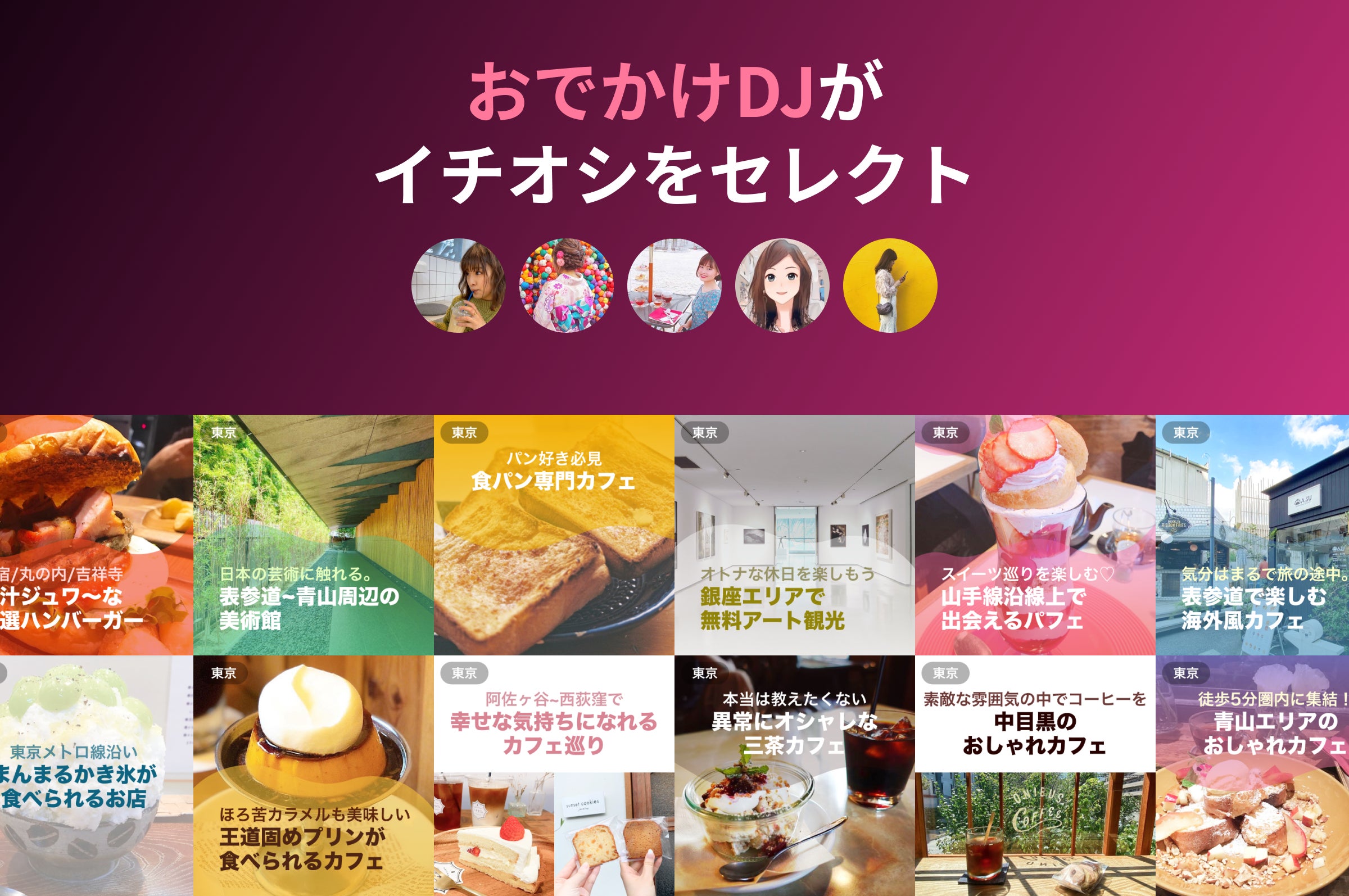 数々の良質スポットを知り尽くした「おでかけDJ」が、テーマにあわせたイチオシのスポットを厳選してパッケージ化しています。一般的なまとめサイトと違い、複数のスポットをマップでまとめて把握でき、そのままお気に入り保存も可能です。