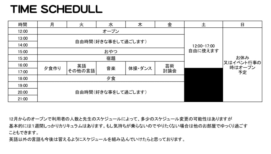 営業時間は基本は月曜日〜金曜日の12:00〜21:00と土曜日の12:00-17:00までの時間のお預かりで、利用料金は全て無料(レッスン費用・食費・施設利用費用)になります