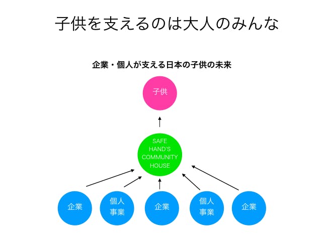 日本の未来を担う子供たちにチャンスを与えたいという『SAFE HAND'S COMMUNITY』事業理念に賛同し応援してくださる企業や、個人事業の皆さまからの協力金で運営をしていきます。