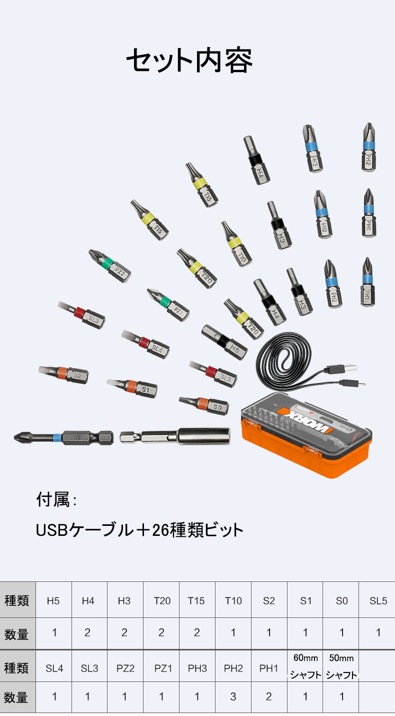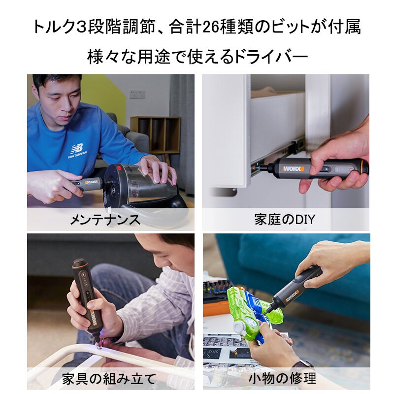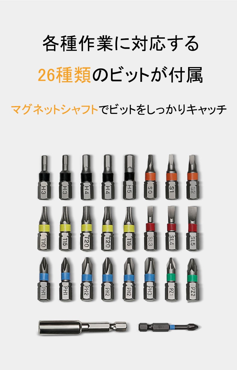 マルチ電動ドライバーは26種類のビットが付属していて、様々なシーンに使用可能です。