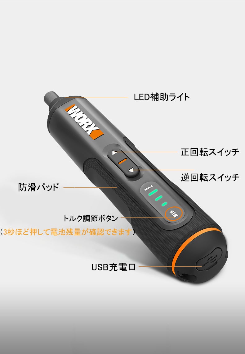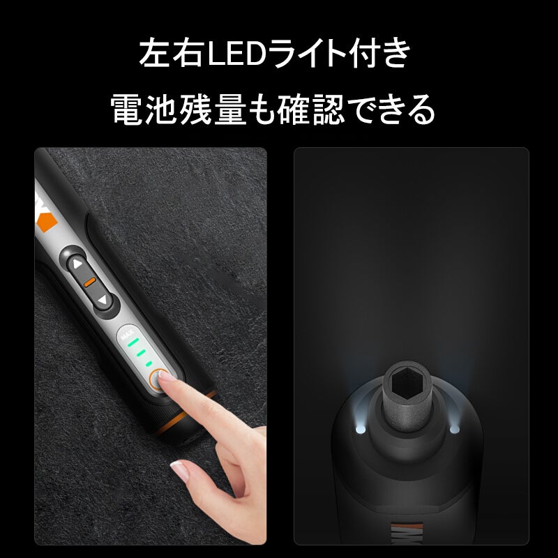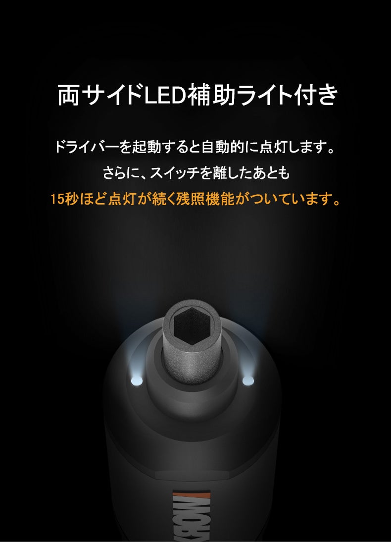 先端部には、補助光としてLEDライトが仕込まれており、ネジの頭や周辺部を明るく照らして作業がアシストできます。