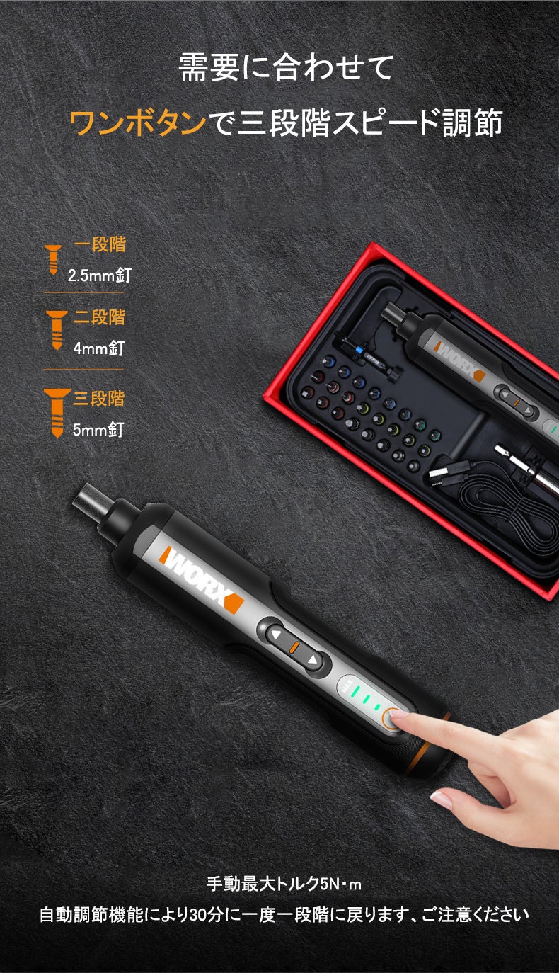 作業中のスピードは3段階で調節が可能となります。最大5mmトルクで30分間に達すると自動で一段階2.5mmトルクに変え、スピードダウンモードを搭載します。