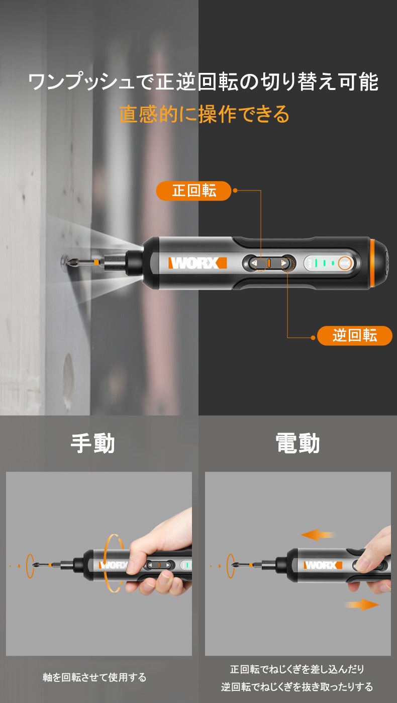 電動だけではなく、手動でも使えます。素早く回すときは電動、少し力が必要なときは手動と切り替えられます。
