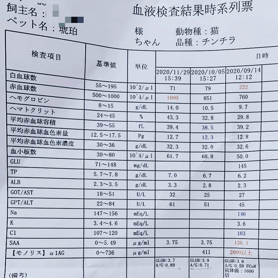 (0.8以上が正常値。FIPを罹患した猫ちゃんはこのA/G値が低くなってしまうんです。薬を飲んでいかにこのA/G値を上げるかがポイントになります。あとは貧血が特徴なので白血球の数値もポイント)