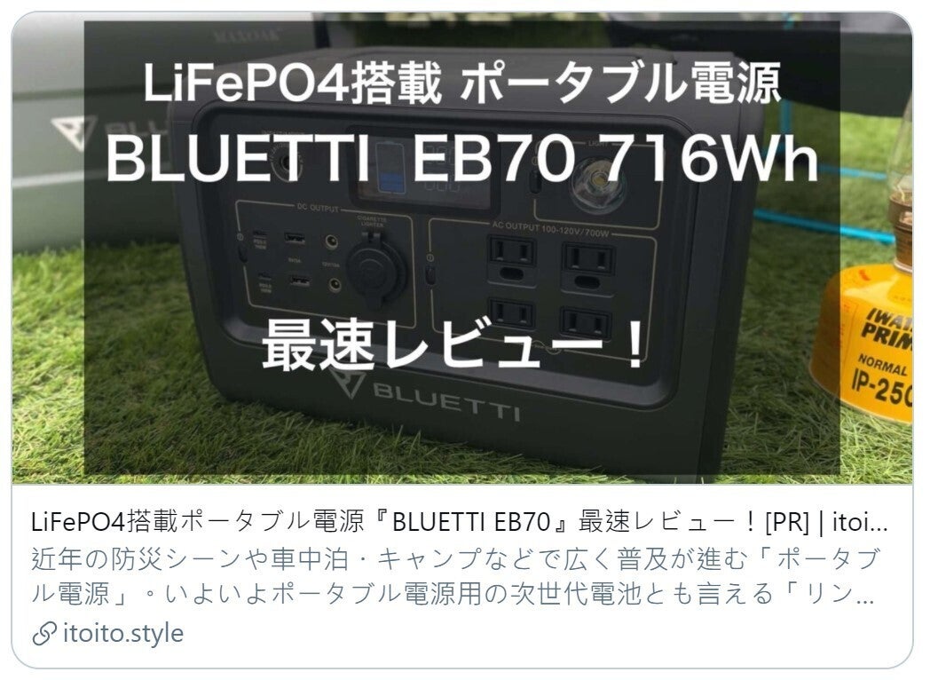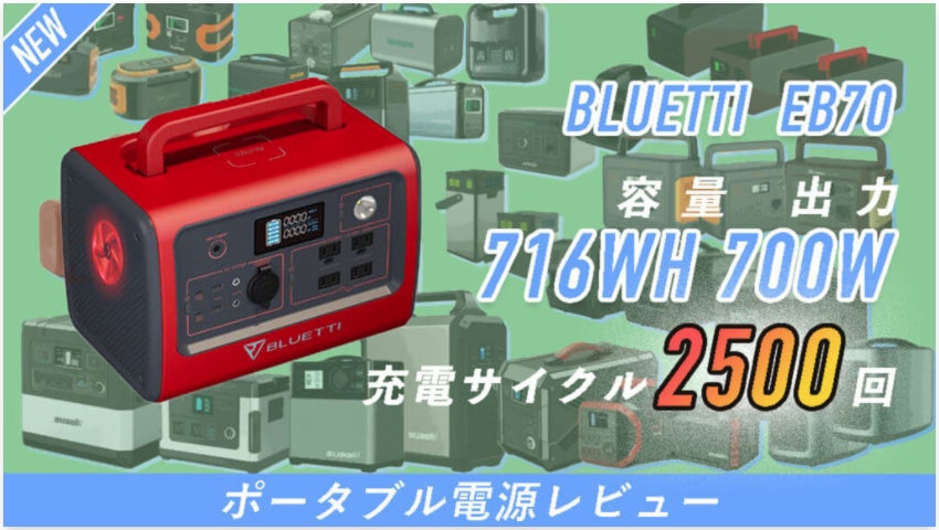 【BLUETTI EB70レビュー】ポータブル電源で特に安全性が高いバッテリー搭載した最新モデル