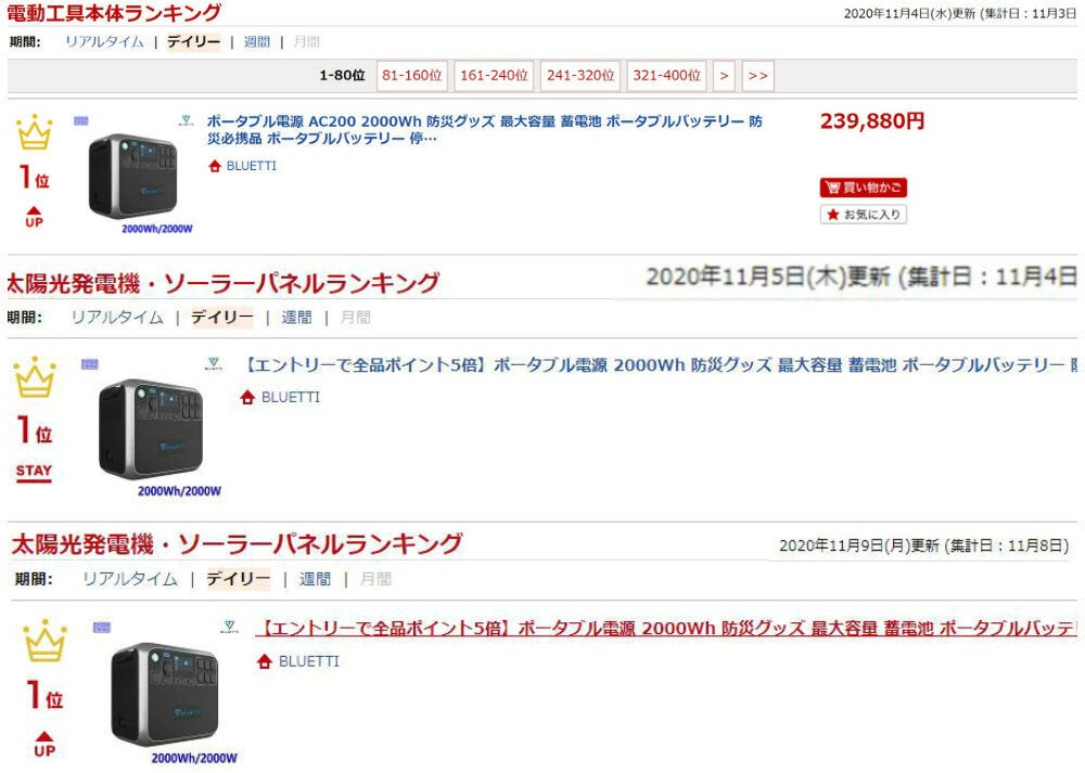 更に「BLUETTI AC200」は楽天ショップで発売開始早々に、売れ筋ランキング1位を獲得しました。現在圧倒的な高評価レビュー4.64点を取っています。今回コロナ環境下での災害対策、アウトドアライフを応援するためにセット品として特別価格で提供いたします! つまりAC200の商品価格とほど同じ金額(249,880円)で、見た目オシャレなEB70がオマケで付けます。ぜひAC200とEB70をまとめてお得なこの機会をお見逃しなく!