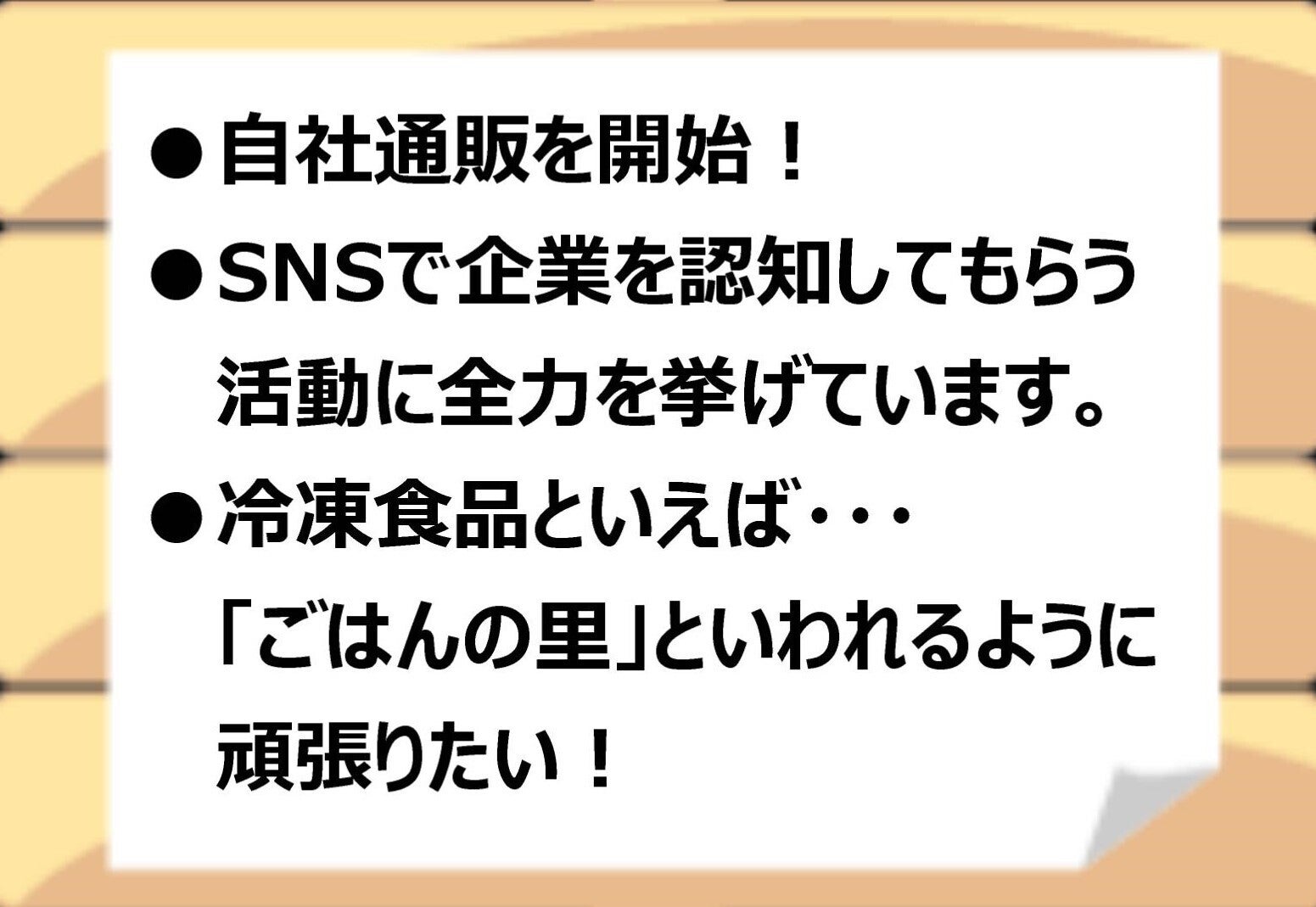 まだまだ冷凍食品メーカーとして、努力を重ねて便利でおいしい冷凍食品を開発してまいる所存ですので、今後ともどうぞよろしくお願いいたします。