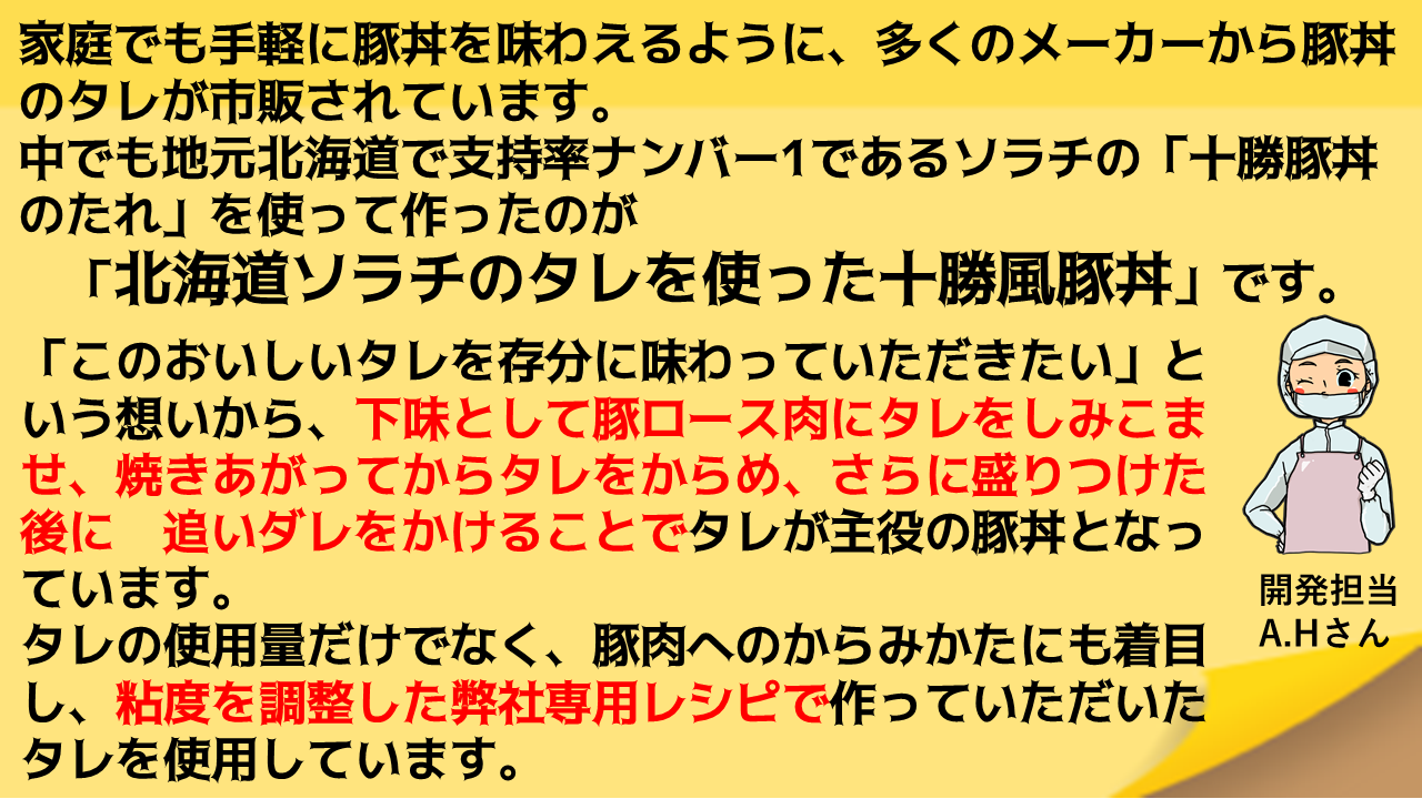 当社の製造設備や冷凍技術などを生かして、家庭用向けの商品、特にテレワークなどで家庭での昼食が多くなっていることから、昼食で食べられるような十勝風豚丼を開発して販売したいと考えております。
