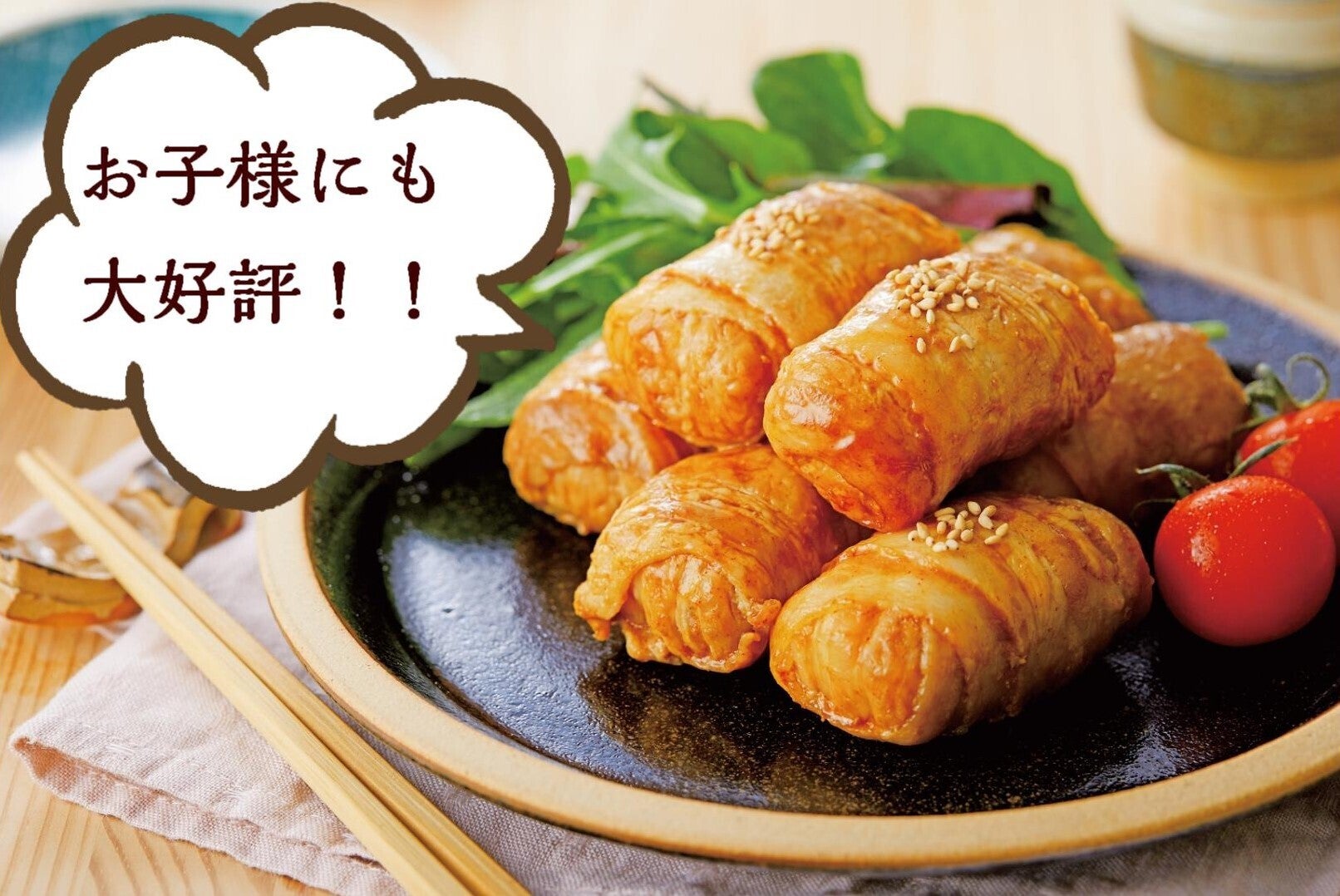 ごはんにキャベツ、紅ショウガ、イカ天、魚粉を混ぜ込んで、豚肉で巻き、オーブンでしっくりと焼き上げ最後にお好み焼きソースを絡ませました。こちらもご家庭で使いやすいように一口サイズ、広島ならではの商品です。