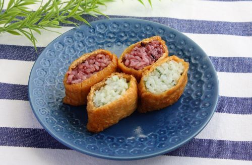 通常のいなり寿司より小さい一口サイズのいなり寿司に、黒米を混ぜて炊き上げた酢飯を詰めました。鮮やかな黒米お皿を引き立てます。