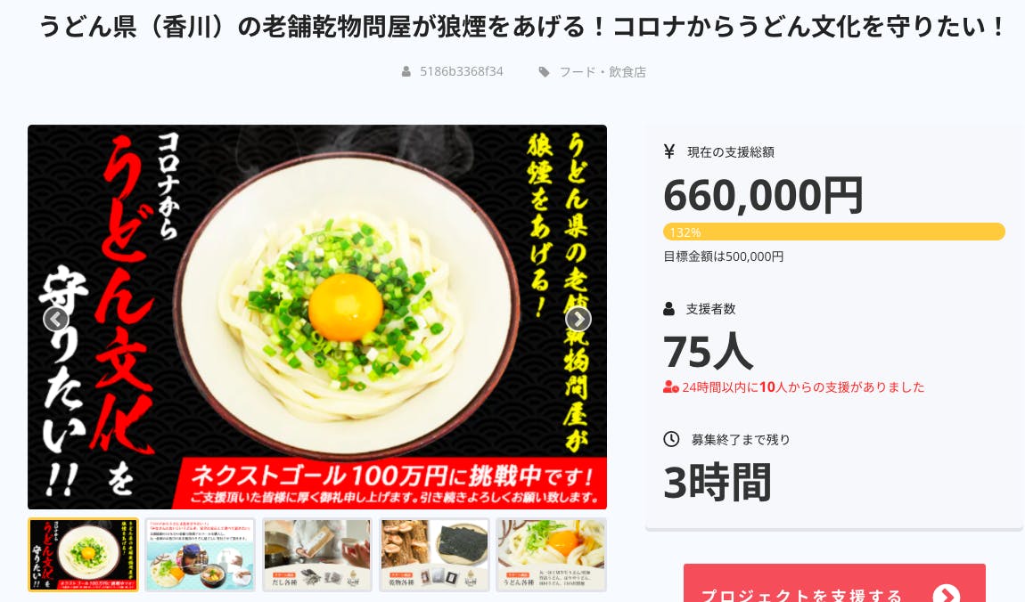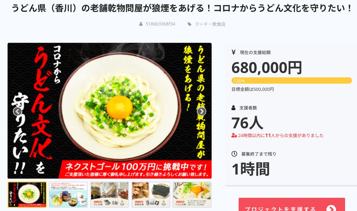 2021/01/11 20:19『クラウドファンディング終了まであと3時間!』あっという間に終了まであと3時間になりました!本日だけで、11名の方に支援を頂きました!これまでに、頂いたご支援の10%をアルコールに変えて、香川のうどん屋さんに配布をさせてもらいました!今日で終わってしまうのが少し寂しい気も、、、、皆さん、もう少しだけ、力を貸してください! もっと見る