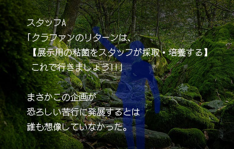 紡ネンを動物園に展示する際に、ネンの行動とリアル粘菌の行動をリンクさせようと考えています。そのため、そこで展示するためのリアル粘菌を採取するために運営スタッフが山に入り、粘菌を採取します。