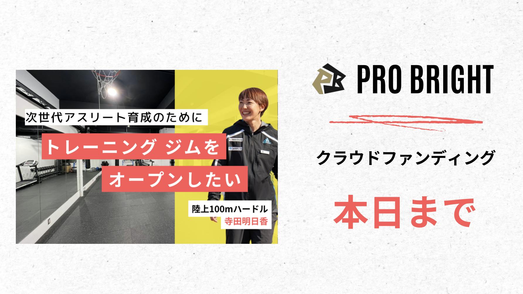 2023/05/23 10:21お世話になります。この度、株式会社Brighter Hurdler(代表取締役:寺田明日香)は新規事業としてトレーニングジム『PRO BRIGHT』を6月に都内でオープンする運びとなり、一昨年に続き2回目のクラウドファンディングを実施させて頂いておりますが、キャンプファイヤーのクラウドファンディングは支援期間も残り5日となりました。現在支援率は97%となっており、目標達成まで残りわずかとなっております。沢山のご支援本当にありがとうございます。リターンでは、ジム施設内でトレーニングを体験できる権利や寺田明日香の大会応援グッズなどをご用意しておりますので、是非詳細をご確認いただければと思います。https://camp-fire.jp/projects/view/662022募集期日 : 2023年5月8日(月)-2023年5月28日(日)また現役アスリートである寺田本人も5月に開催された2大会でも自己ベストを更新・優勝し、6月に開催される日本選手権での更なる記録更新を目指して参ります。こちらも是非ご注目いただき、ご声援いただけると幸いです。引き続きよろしくお願い申し上げます。 もっと見る