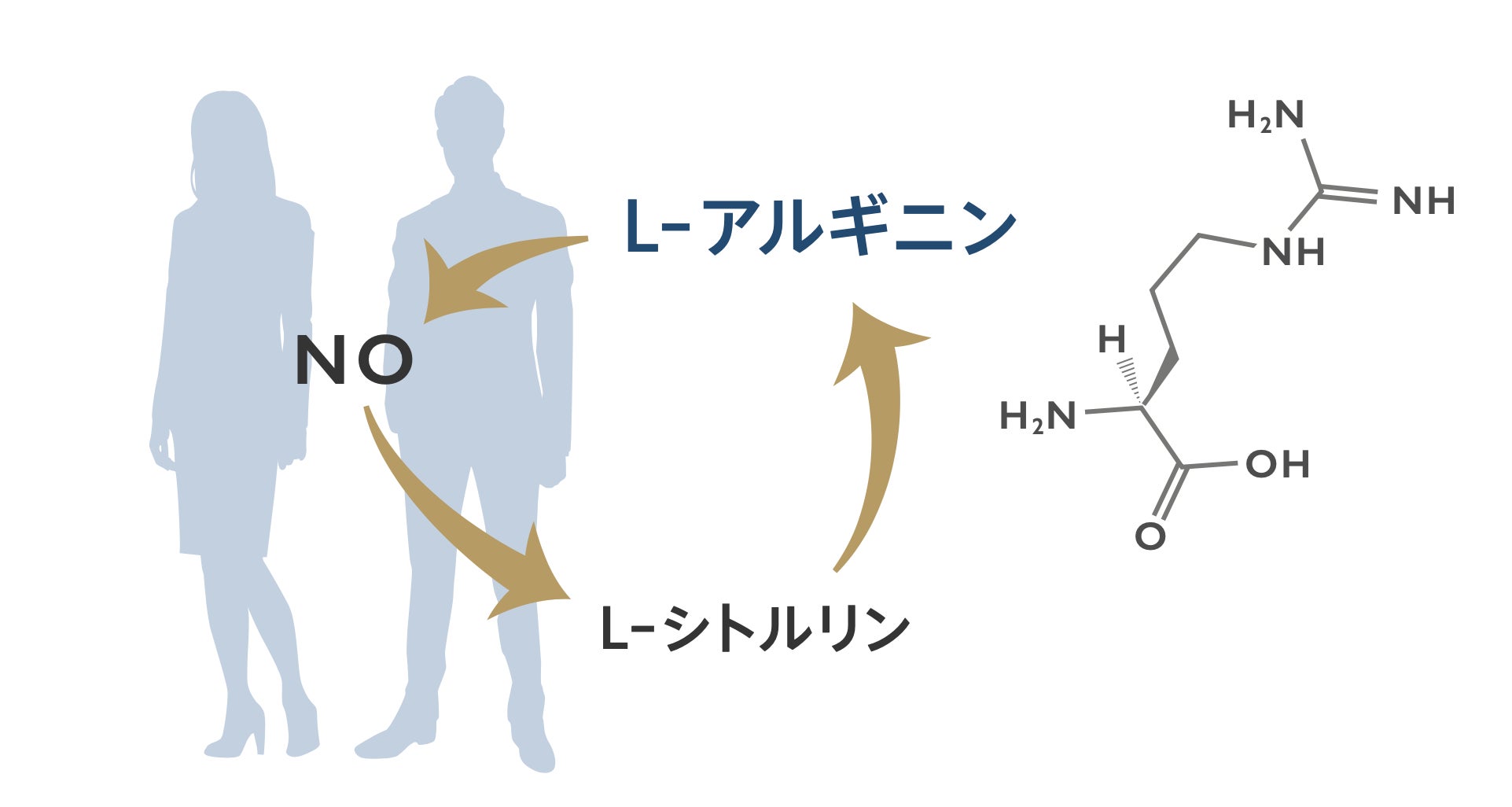 L-アルギニンは、身体の巡りを活性化させるNO(一酸化窒素)を生み出すために必要なアミノ酸です。NOの人体における働きや、L-アルギニンによるNO産生サイクルについての研究は、1998年にノーベル生理学・医学賞を受賞しています。
