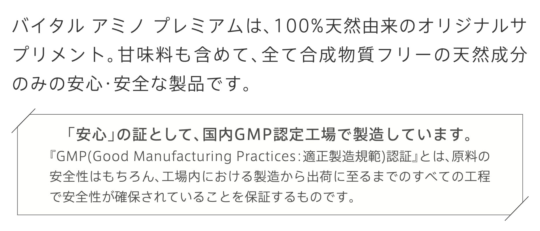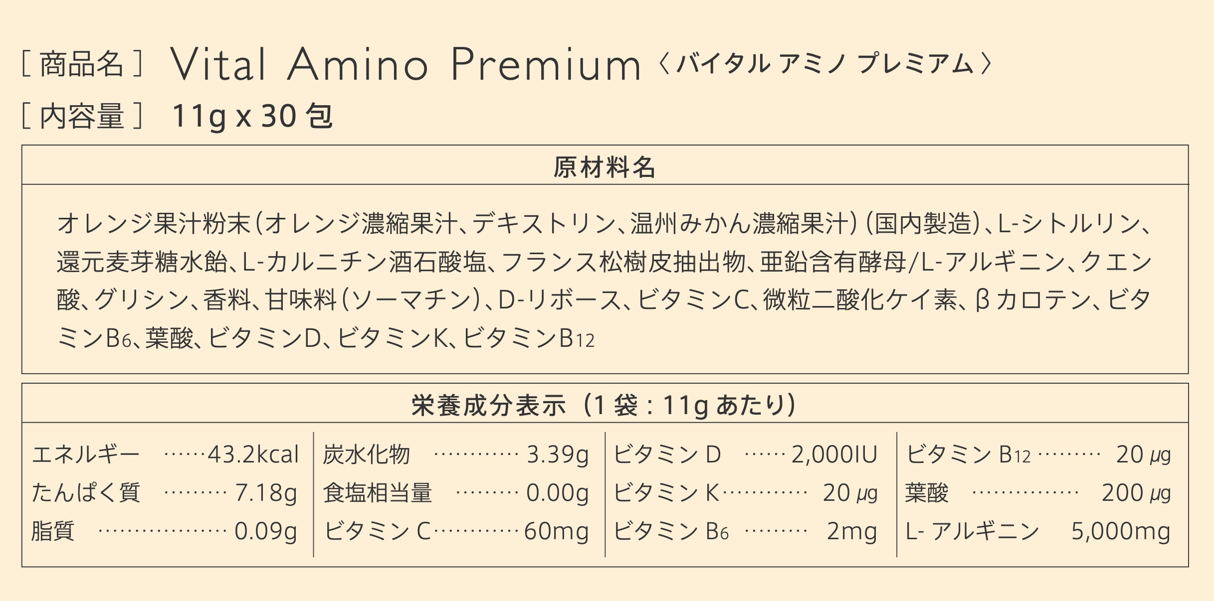 年齢を重ねるにつれて体内での生成量が減るため、食事だけで効率よく摂取することには限界があります。バイタル アミノ プレミアムには、高品質のL-アルギニンが 5000mgも配合されており、美容、健康維持、ボディメンテナンスに効果的に働きかけます。