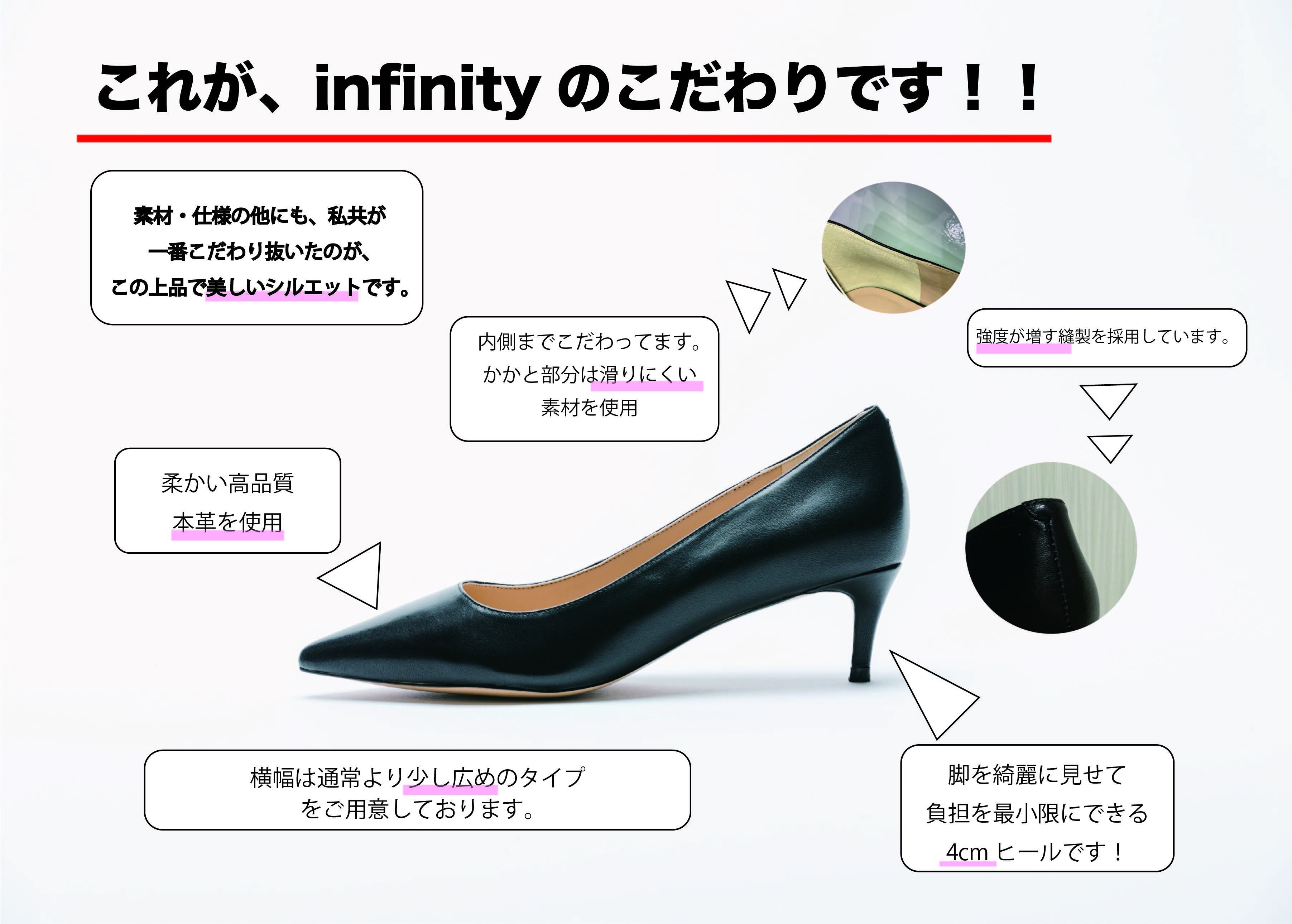 一刻も早く皆様に商品をお届けしたい思いで商品開発を行ってきました。是非infinityのパンプスで今までに叶わなかった足元のお洒落を楽しんでください。