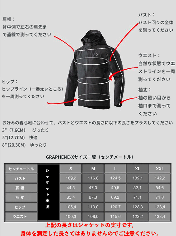 Graphene-X αシリーズジャケットは、日本製の洋服よりも少し大きめの作りとなっておりますので、普段着ているものの一つ下のサイズをお選びいただくことをオススメしております。