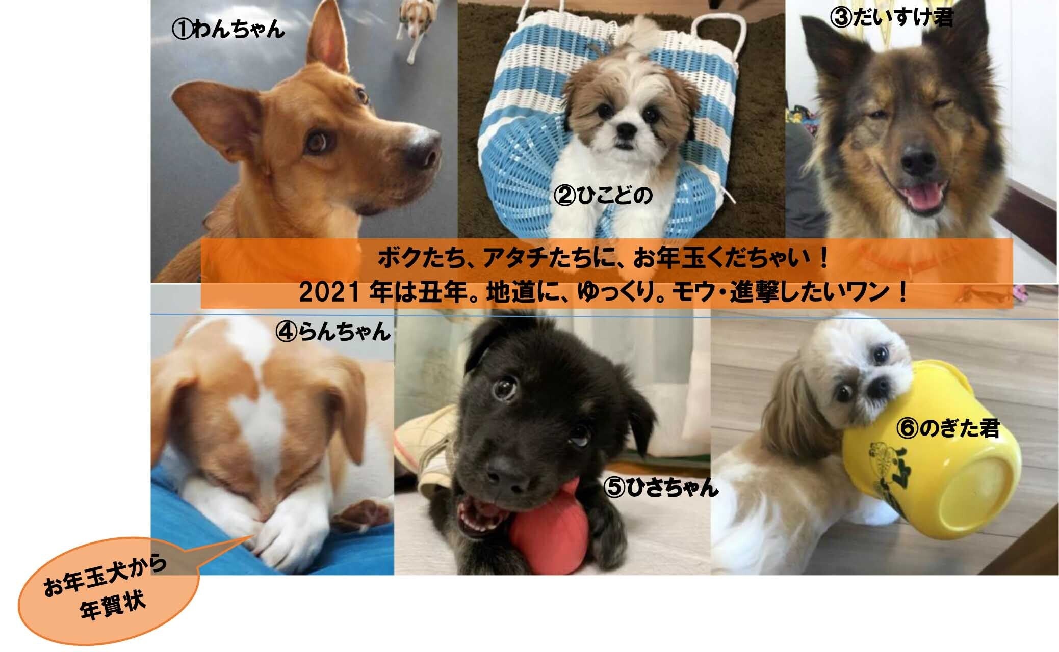 ■Topics1: ボクたち。アタチたちに「お年玉」くだちゃい! 6頭の協会犬から1頭を選んでお年玉をお願いしま~す。選んだ子から年賀状をお送りさせていただきます。