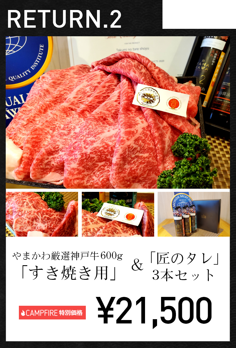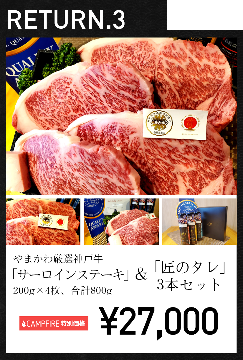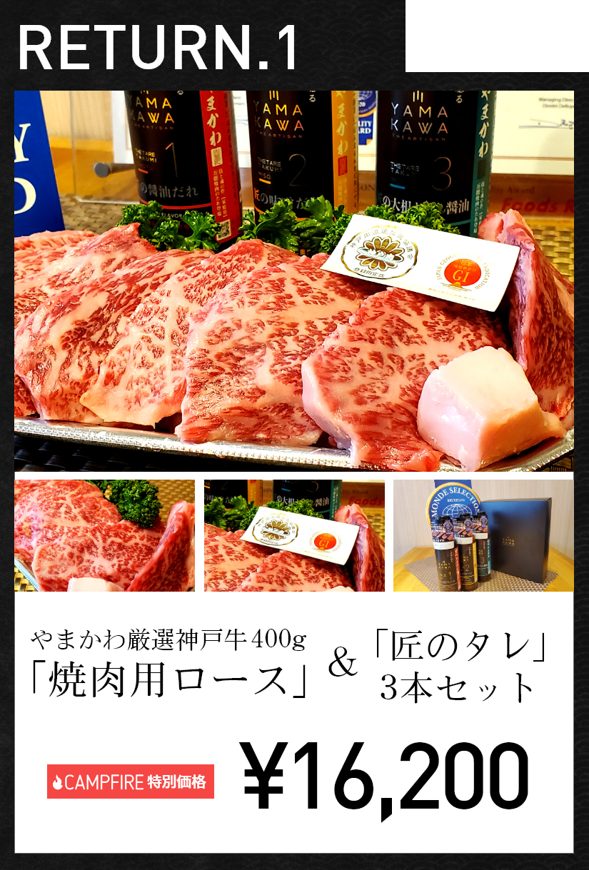 焼き肉用、すき焼き用、ステーキ用と厳選した神戸牛を確保しました!合わせて本プロジェクト限定、ここでしか手に入らない当社オリジナルのモンドセレクション金賞受賞「匠のたれ」を3本セットでお届けします!この3種類は、やまかわの匠たちが吟味に吟味を重ね絞り込んだ末、誕生した究極の3種類です。すなわち、この3本セットは、いわば、「贅沢な食べ比べ」を楽しむための“あえての”3本セット!やまかわ厳選最高の神戸牛とタレでお家焼肉にすき焼き、ステーキと… 存分にお楽しみいただきたいと思います!やまかわはいつでも、シンプルに「うまい肉」で応援したいのです!