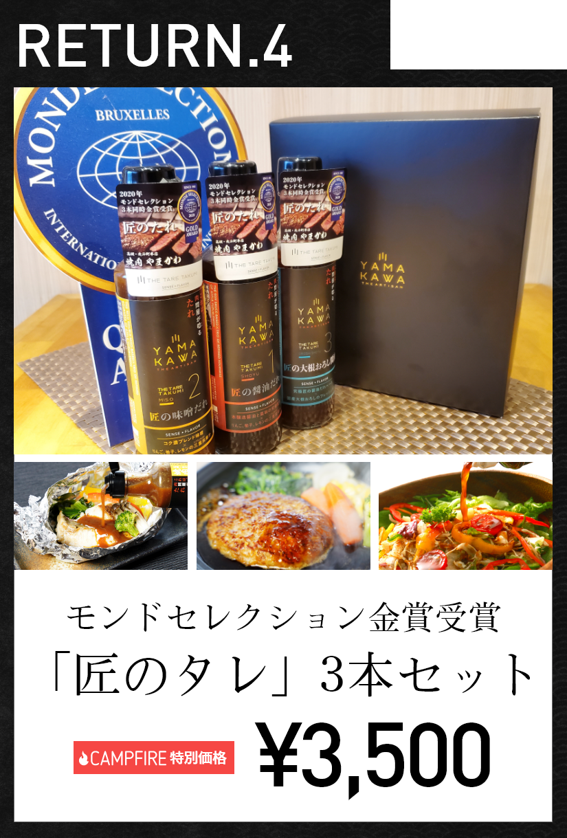 ※匠のたれ3本セットのみのリターンもご用意しております。この機会に、是非ご支援のほどよろしくお願いいたします!