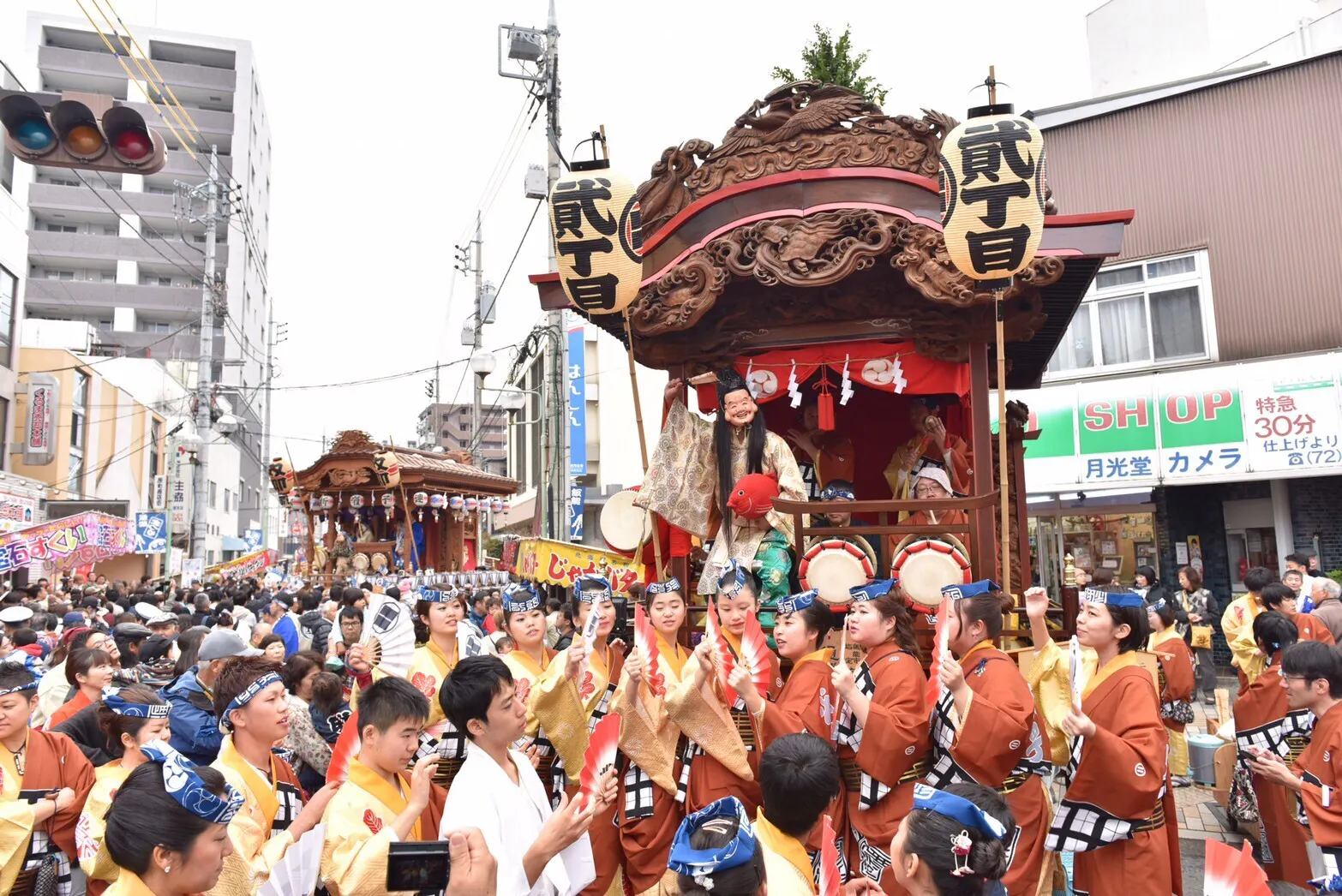 各11カ町の勇壮絢爛な山車屋台が街中に繰り出し、にぎやかな屋台囃子が響き渡ります。