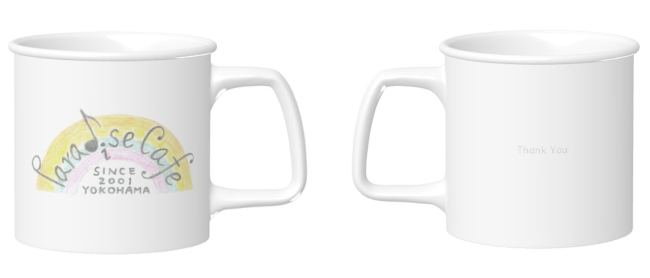 虹の五線紙にParadise Cafeのロゴが並ぶ、クラウドファンディング限定のオリジナルデザインマグカップ