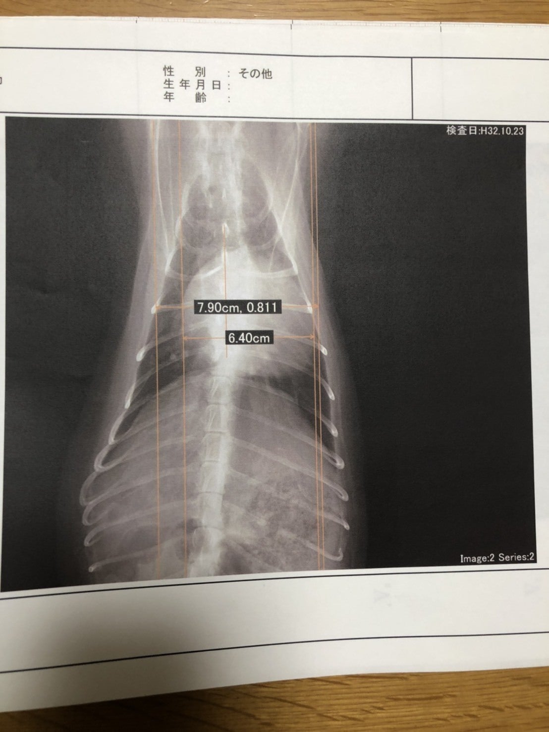 レントゲンでは正常60%未満の心胸比が81.1%で心拡大が認められる。心拡大があり、気道を圧迫しているとのこと