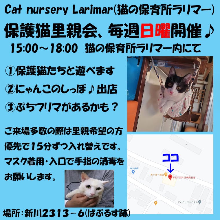 2021/02/24 09:49予定通り2月22日にCat nursery Larimarが運営する保護施設「猫の保育所ラリマー」オープンしました。ご支援ありがとうございます。プロジェクトの支援金は3月1日に入る予定です。現在はゆうちょ銀行にお寄せ頂いた支援金と、アマゾン欲しい物リストからの物資のご支援をありがたく使わせて頂いております。 昨日2月23日、施設で保護中の「コツメ」にトライアル希望がありました。現在、先住猫さんとの相性を見てもらっているところです。コツメ自身はどこでも誰とでもやっていける性格なので、先住猫さん次第です。現在、施設に居る猫たちです。全員避妊去勢済み、スー・ハヤト・ハッチは元気に駆け回る体力有り余った生後5~6ヶ月の大きめ仔猫、リバー・フジコは抱っこや膝の上で静かに甘える成猫たちです。子供たちと一緒に遊び回るなら仔猫、ゆっくりモフモフしたいなら成猫がオススメです。特にリバーは初めての場所でも他に猫がいてもへっちゃらで抱っこ大好き甘えん坊なのでイチオシです♪グーグルマップで検索すると出て来る地図&施設入口画像(前店舗・ばぶるす時代に撮影されたもの)です。施設見学可能なのは基本的に平日は19時くらいからです。前日までに下記へご連絡下さい。mononoketama2@gmail.comCat nursery LarimarのSNSについて下記の3つが代表の小林が管理しているものです。インスタはスマホを持っていないので投稿が行えず、施設住み込みボランティアのHさんに管理してもらっています。何か問い合わせがありましたら下記の3つからメッセージお願いします。フェイスブック https://www.facebook.com/larimar.catnurseryツイッター https://twitter.com/CATNURSERYLARI1ブログ https://ameblo.jp/nekonoie1/ もっと見る