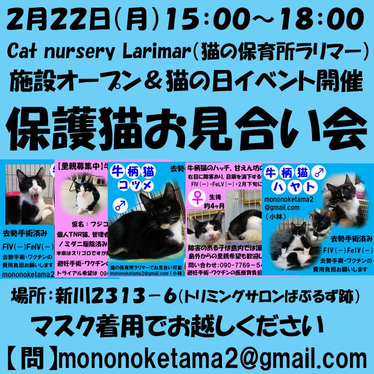 初プロジェクト「保護団体の無い石垣島に保護施設を作りたい」に御支援下さった皆様、ありがとうございました。今回、石垣島の保護団体ラリマーは5回目のクラウドファンディングに挑戦する事になりました。これまでにラリマーは4回クラウドファンディングに挑戦、うち2回が目標額達成、2回は目標額には届きませんでしたが、多くの方から御支援を頂きました。新プロジェクトは「500頭以上の猫たちが捨てられた、小さな島からのSOS」です。500頭以上の猫たちが捨てられた、小さな島からのSOS6月23日 オリコンニュースにもなった5年で500匹超が遺棄された石垣島の緑地公園。石垣島の保護団体『Cat nursery Larimar』は不幸な猫たちを見守り、傷病治療をしています。 かかる費用は膨大で、メンバーだけでは支払い切れない額にもなります。設立3年目の小さな団体にどうか御支援お願いします。2023.7.27Cat nursery Larimar