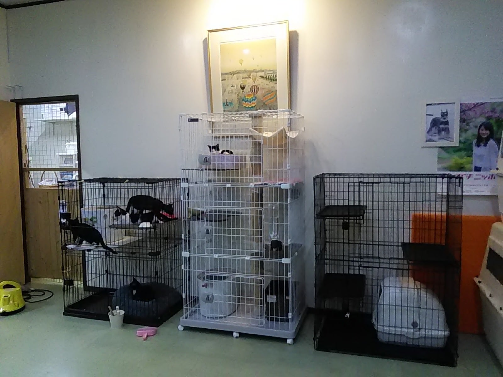 3つのケージの左は代表の小林宅から持ってきた空きケージ、真ん中はボランティアのMさん宅から中身(保護っ子)入りで本日運ばれてきたもの、右は住み込みスタッフHさんが飼い猫用に購入したが猫たちが入ろうとしないから保護施設で使おうという事で居住スペースから保護スペースに移動したものです。