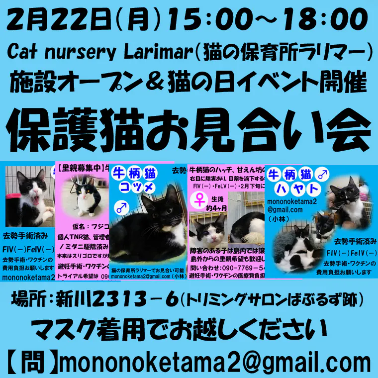 2月22日15:00~18:00に保護っ子たちのお見合い会(里親会)と、猫雑貨屋「にゃんこのしっぽ♪」さんから商品をお借りして小さな露店を開きます。