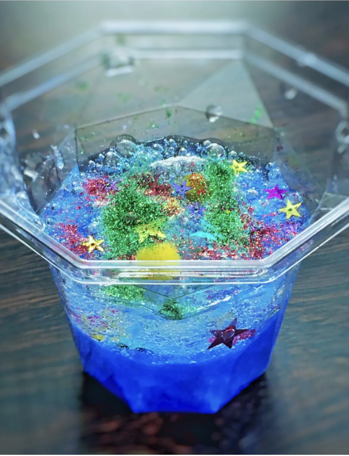 散りばめたラメやスパンコールを透明のスライムで閉じ込めたり、