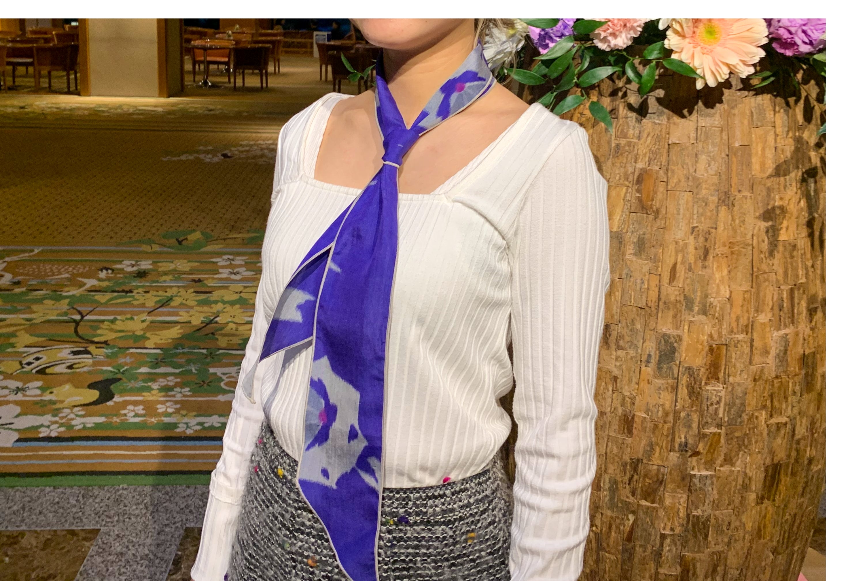 シルク100%の風合いが上品にコーディネートをまとめてくれます。触り心地が優しいスカーフです。首元に巻いても、バッグの持ち手につけてもお楽しみいただけます。