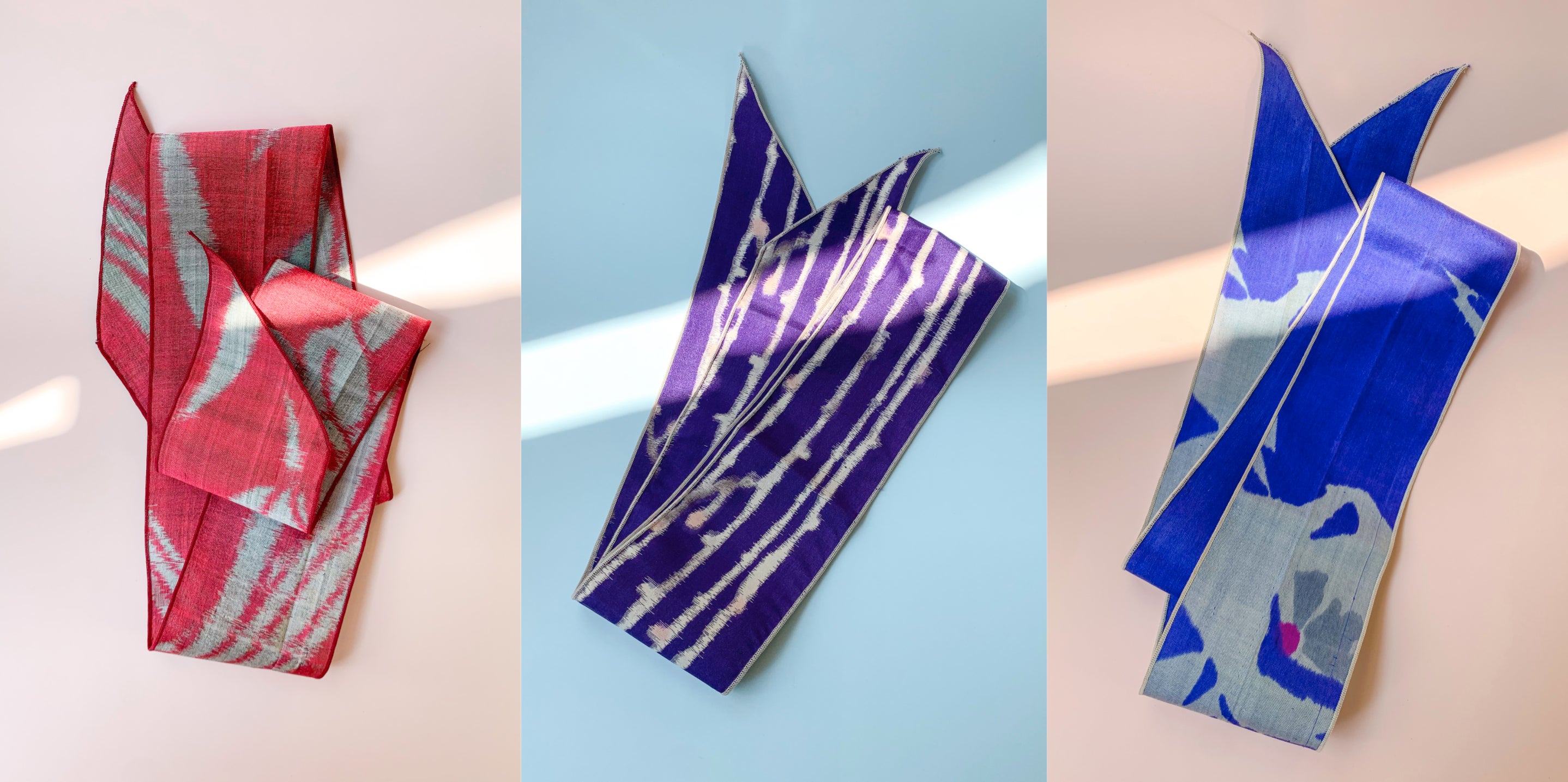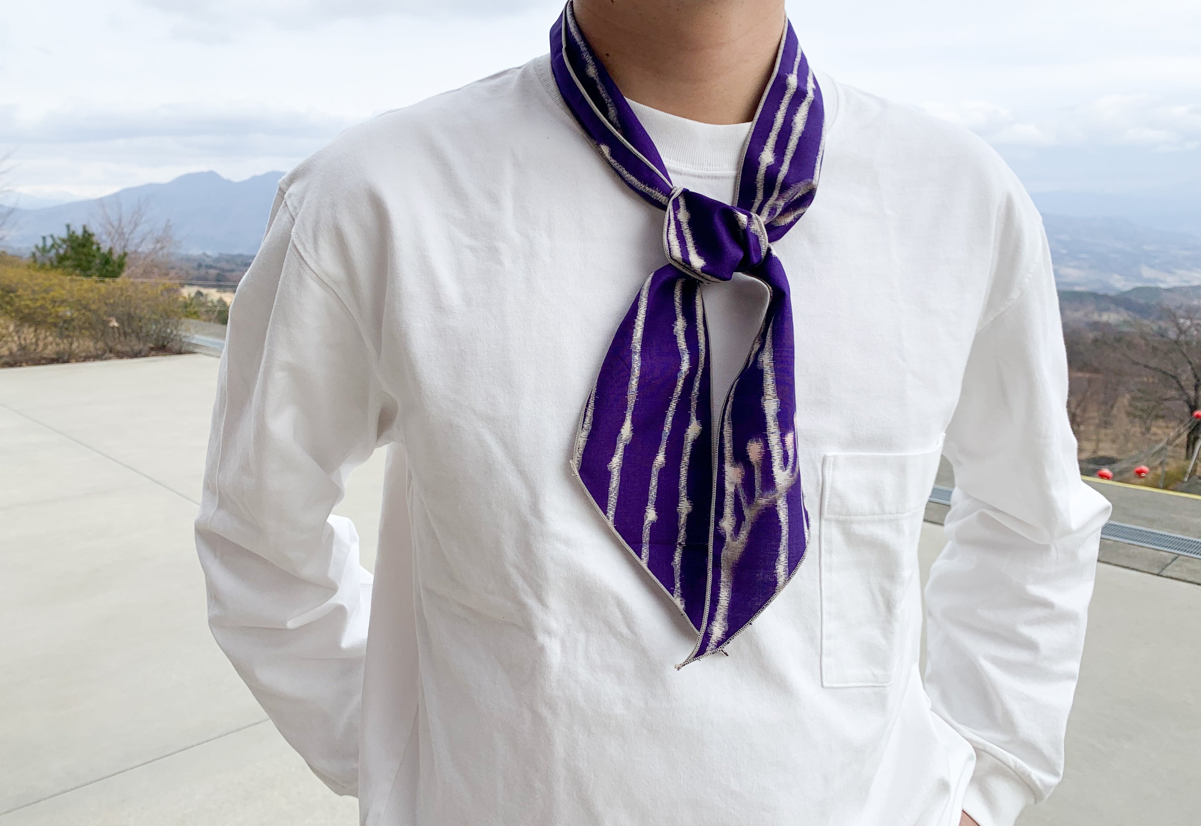 銘仙は織物ですので、裏表がありません。その特徴を活かし、裏表を作らない=縫い目をなくしたスカーフができました!織物の特性上、加工法の調整に時間がかかっていましたが、協力いただいている群馬県伊勢崎市の縫製工場長が試行錯誤してくださり、スカーフが完成しました。