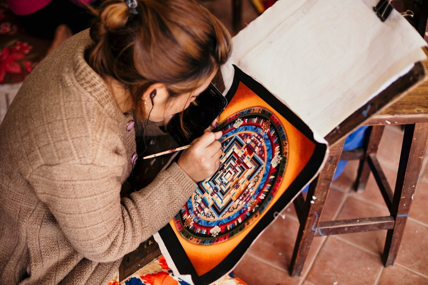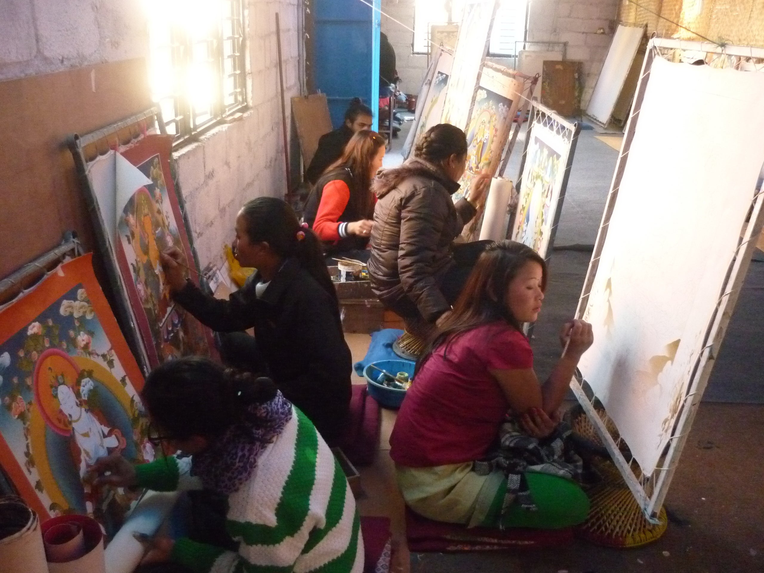 ネパールの曼荼羅制作は数百年の歴史を持ち、その優れた技術は代々一子相伝で受け継がれてきました。外部の熱意ある者が受け入れられるようになったのはつい最近のことです。曼荼羅画家の家に生まれた子は通常12歳から14歳で修行に入り、朝早くから夜遅くまで一心不乱に描き続け10年から15年かけて一人前になります(写真は修行中の若き曼荼羅画家)。そこからさらに精進を続け、弊社がお取り扱いする一級品レベルの曼荼羅を描けるまで成長するのはほんの一握りです。