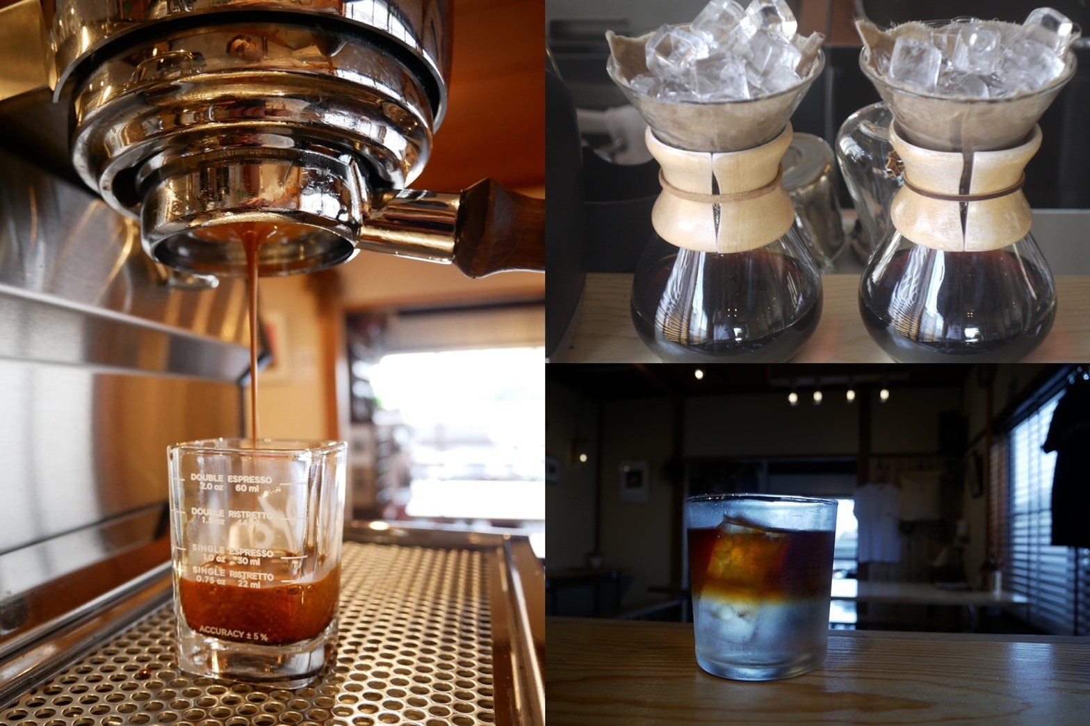 エスプレッソ抽出の様子(左)こおり出しアイスコーヒー(右上)スパークリングコーヒー(右下)