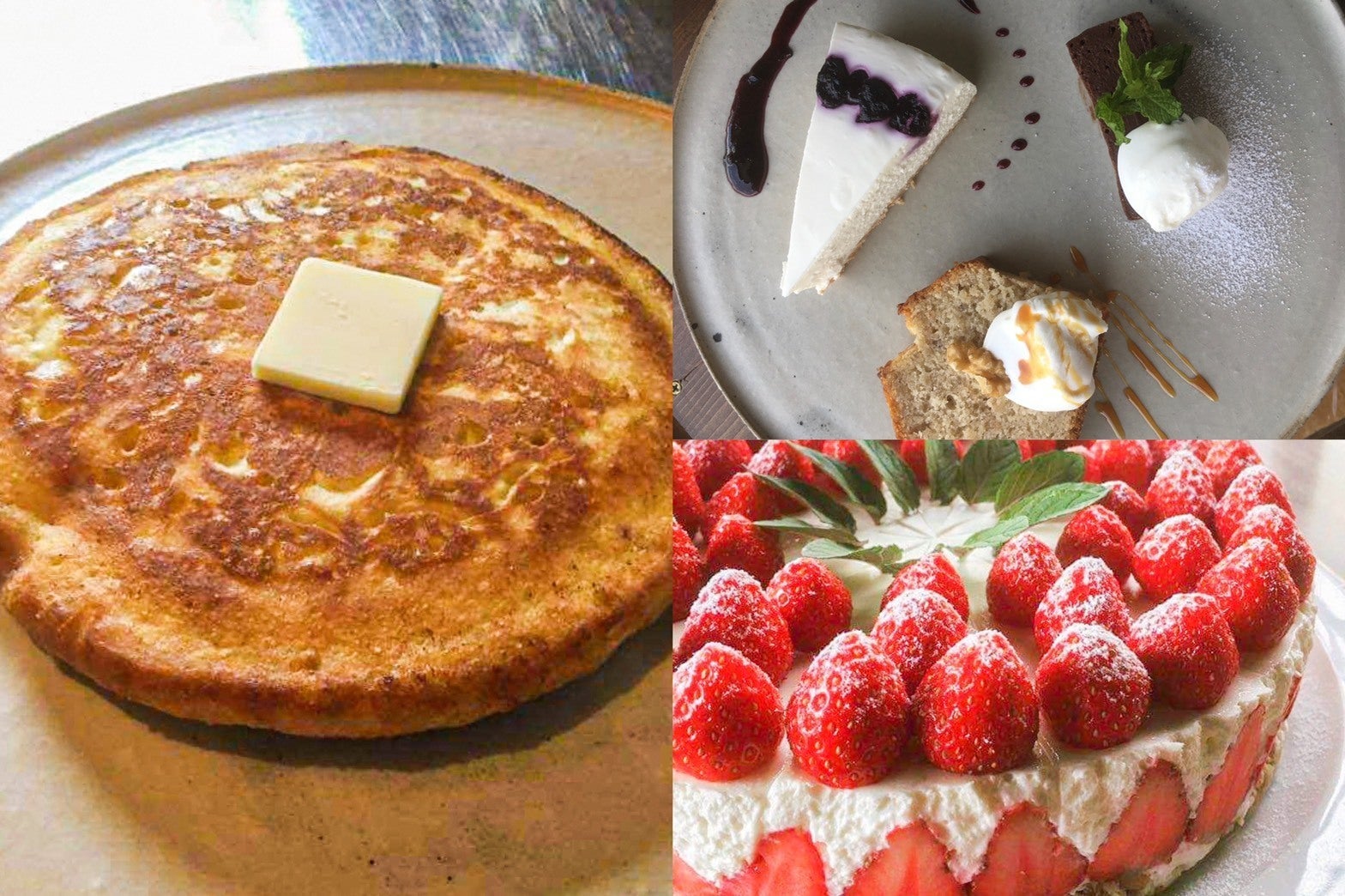 ホットケーキ(左)自家製スイーツ三点セット(右上)いちごと自家製苺シロップのレアチーズケーキ(右下)