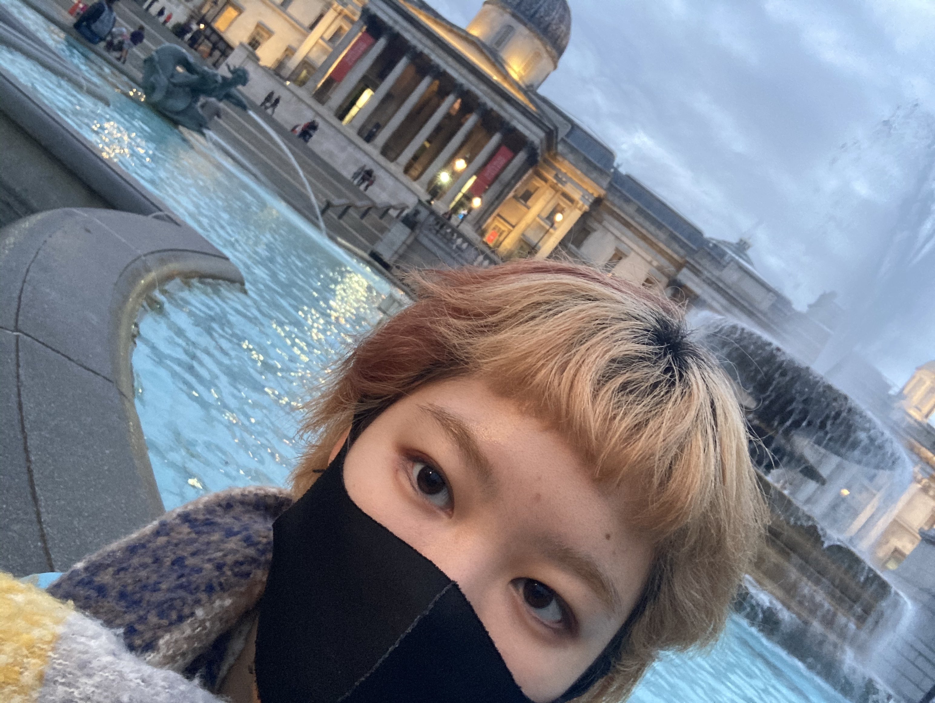 ここでロンドンらしい写真の一つでもあげたいところですが、アカデミー近くのナショナルギャラリー(入館料無料)の前で寒さのため笑顔が一切伺えない写真のみ発見されたのでお納めください。