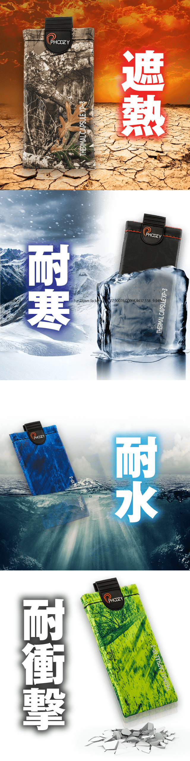 ケースの素材は、アメリカで特許を取得し、NASAの宇宙服にも使用されている放射熱防壁技術を応用した、独自のChromium Thermal Barrier™技術による4層構成。外層は太陽光の90%以上を反射します。そして内層は、低温度下でデバイスを絶縁。PHOOZY XP3を使用していない場合と比べて、バッテリーを最大4倍まで長持ちさせます。